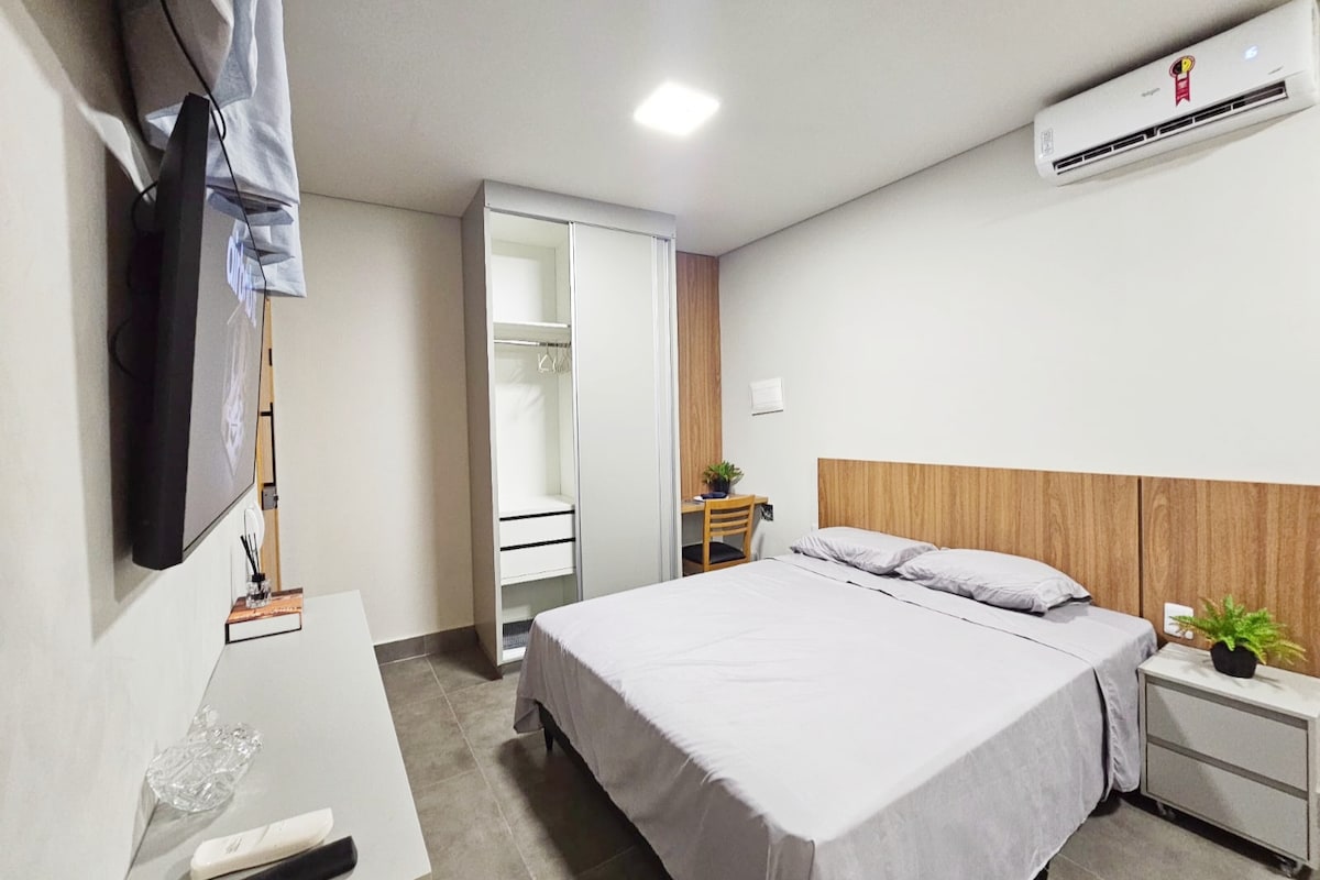 Novo sastavljen Kitnet; Comporta 02 osobe, par ili samac; Rotirajuće besplatno parkiranje; Улазак са препознавањем лица; Sve je namješteno: posuđe, frižider, mikrotalasna pećnica, friteza, blender, električni filter za vodu, mašina za sušenje veša, pegla; Wi-Fi internet i pametna televizija; Komplet za bračni krevet i kupatilo; Mercadinho auto service 24h in the condominium itself; Zajednički servisni prostor sa mašinom za pranje i sušenje veša; Zajednički prostor za odmor sa roštiljem, bilijarskim stolom i TV-om.