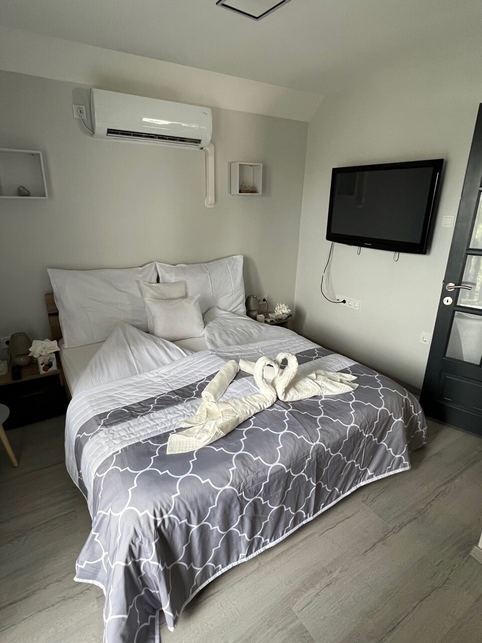 To je idealan mali kutak za parove ili osobu koja dolazi poslovno ili posjećuje porodicu zbog drugih aktivnosti. Potpuno centralni jednosoban stan sa pješačkim pristupom svemu, na minut od autobuske stanice. Spavaća soba ima mali umivaonik sa tuš-kabinom, tako da je udoban za 1-2 osobe, a WC šolja je odvojena. Druga soba je dnevni boravak sa kuhinjom u jednom, opremljen posuđem, tanjirima, frižiderom, šporetom. Ovo je kauč na izvlačenje na kojem možete da gledate TV, ali možete da spavate 1-2 djece.