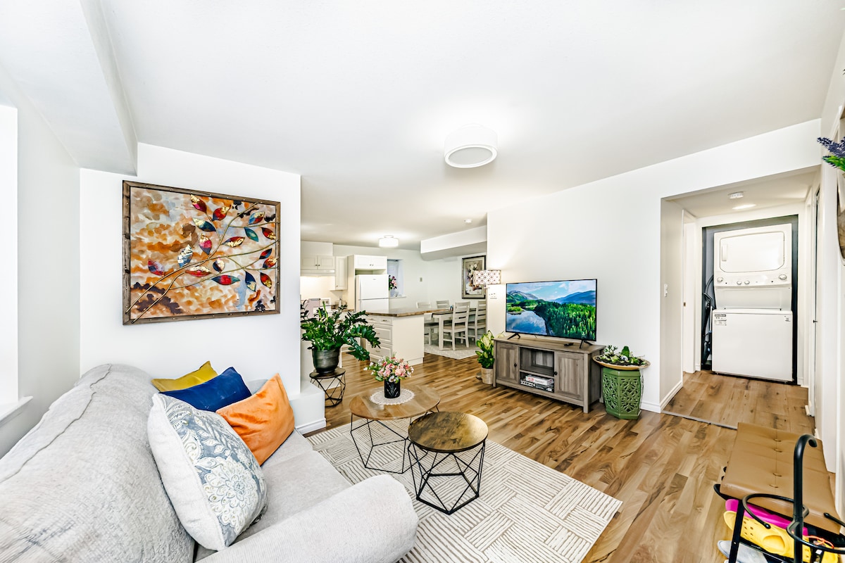 Ovaj udoban, moderan nadzemni podrumski apartman sa 1 spavaćom sobom i 1 kupatilom je svijetao i prostran i nudi sve što vam je potrebno da bi vam boravak bio što udobniji. TV od 70 inča sa kablovskom i Netflix-om, veliki kauč sa duplim krevetom na izvlačenje, Wi-Fi, centralni vazduh, vešeraj u apartmanu, kvalitetna posteljina sa dodatnom posteljinom. Mnogo velikih prozora koji propuštaju mnogo prirodnog svjetla i poseban radni prostor s pogledom na dvorište. Besplatan parking. Privatno dvorište i pušenje je dozvoljeno na otvorenom.