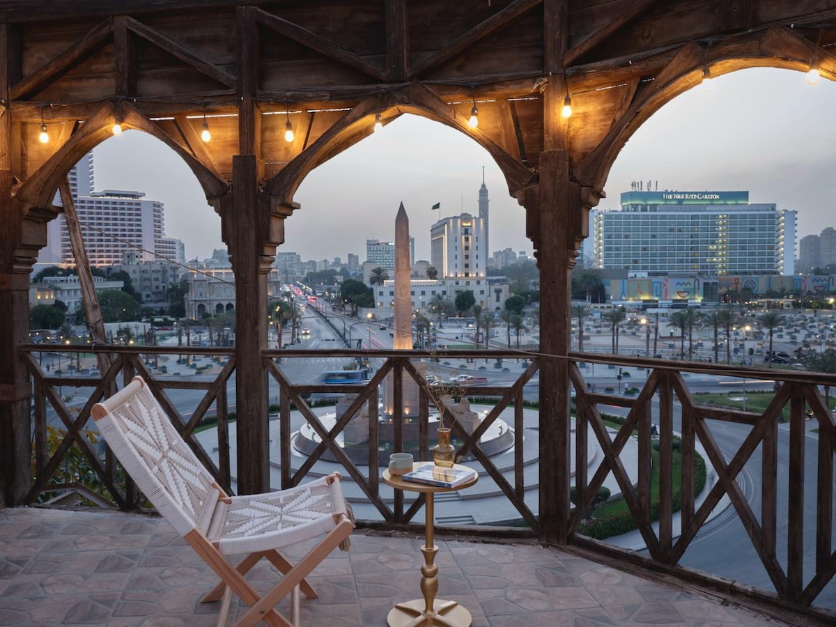 Ceo apartman sa prelepom prostranom terasom sa sjajnim pogledom u srcu Kaira. Ima dve spavaće sobe i veliku dnevnu sobu. Stan ima umjetnički stil, prirodne drvene i radosne boje. Udaljena je 5 minuta hoda do trga Tahrir i starog Egipatskog muzeja, kao i do područja u kojem su restorani, kafići i ulični šiša restorani sveprisutni. Savršena lokacija za upoznavanje centra Kaira pješice. Piramide u Gizi traju samo 45 minuta taksijem.