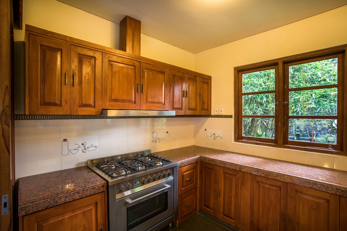 Jedinstveni predlog za Ubud: vila se nalazi samo 1 km od svjetski poznate šume majmuna i glavnog evropskog supermarketa u Ubudu „Coco”; dostupna pješke za 10 minuta od centra Ubuda, ali istovremeno na ivici prostranog polja pirinča; odgovara evropskim standardima smještaja, ali istovremeno napravljenim od drveta i u odnosu na balijsku arhitektonsku tradiciju; sa ogromnim panoramskim prozorima; kupatilo sa modernom kadom. Novoizgrađeno! Besplatan dodatak - skuter sa kacigama.