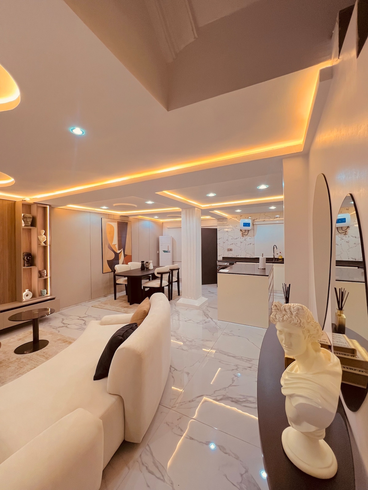 Come enjoy some privacy in this serene, duplex apartment. The modern, stylish aesthetic of this space is perfect for couples’ getaways or solo travellers. It is fully furnished + located in a secure estate. The space is serviced with free, super-fast Wifi & ample parking space. The kitchen is fitted with modern equipment for your convenience. With 24/7 electricity, our smart TV & other luxurious amenities make this a home away from home, with the trappings of a dreamy hotel suite.