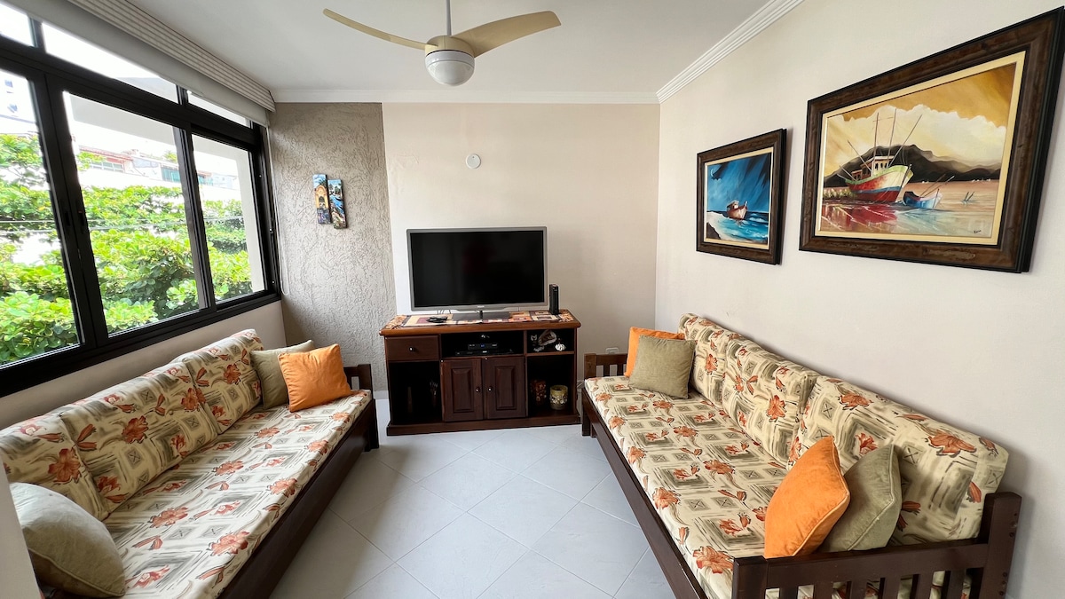 Apartamento de 1 quarto com cama de casal, sala acomoda mais 2 pessoas (o tamanho de cada parte do sofá corresponde a uma cama de solteiro), 2 quarteirões da praia, cadeiras de praia disponíveis, varanda (com rede), cozinha completa com geladeira, fogão, micro-ondas, cafeteira, perto de restaurantes e supermercados. Possui uma vaga de garagem coberta. Localização excelente muito próxima a praia. O prédio NÃO aceita pets. Possui Wi-Fi. Possui ventilador nas salas e no quarto. Check in 15-19h.