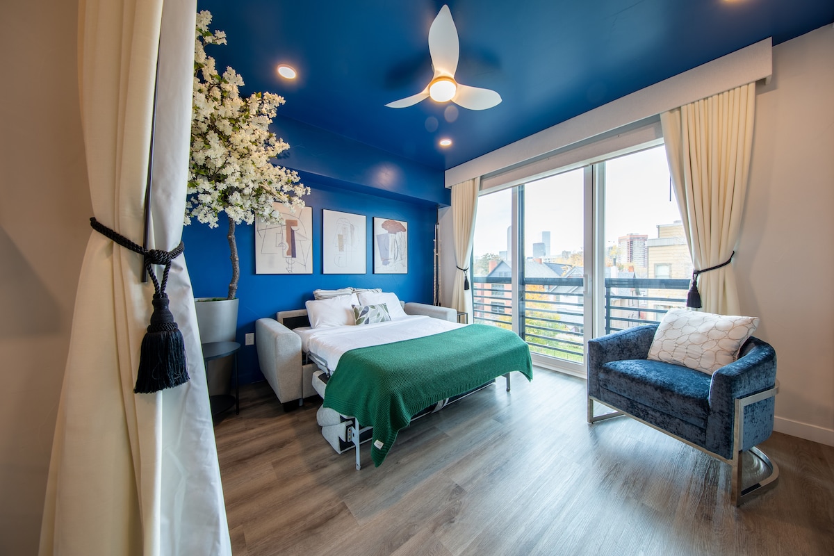 Dobro došli u retro utočište u centru Denvera! Ovaj studio koji je odabrao @ midmodmike, nudi starinski šarm sa modernom udobnošću. Uživajte u pogledu na horizont i spavajte u kalifornijskom bračnom krevetu ispod disko kugle koja se okreće. Dnevni boravak vas poziva da se opustite pored retro kamina ili da se opustite na starinskom kauču od 3 metra. Potpuno opremljena kuhinja, noćna led rasvjeta i retro narandžasta kombinacija tuš-kabine i kade, svaki kutak odiše retro atmosferom. Da li ste spremni da provedete noć u svom privatnom diskoteci?!