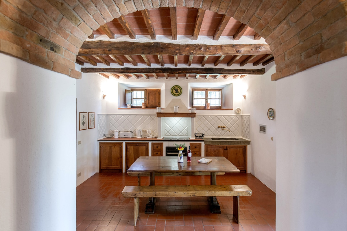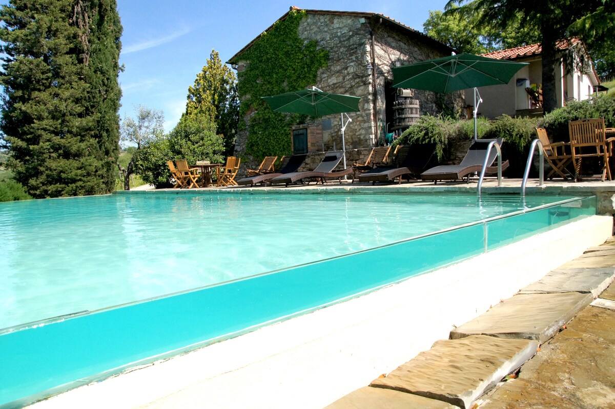 Ovaj stan - privatno ušuškan i uživa u zapanjujućem pogledu sa svoje terase - deo je farme "agriturismo" koja proizvodi organski Chianti Classico. Prostran i lagan, ima 1 dvokrevetnu spavaću sobu, 1 dnevnu sobu, 1 kupatilo i kuhinju.