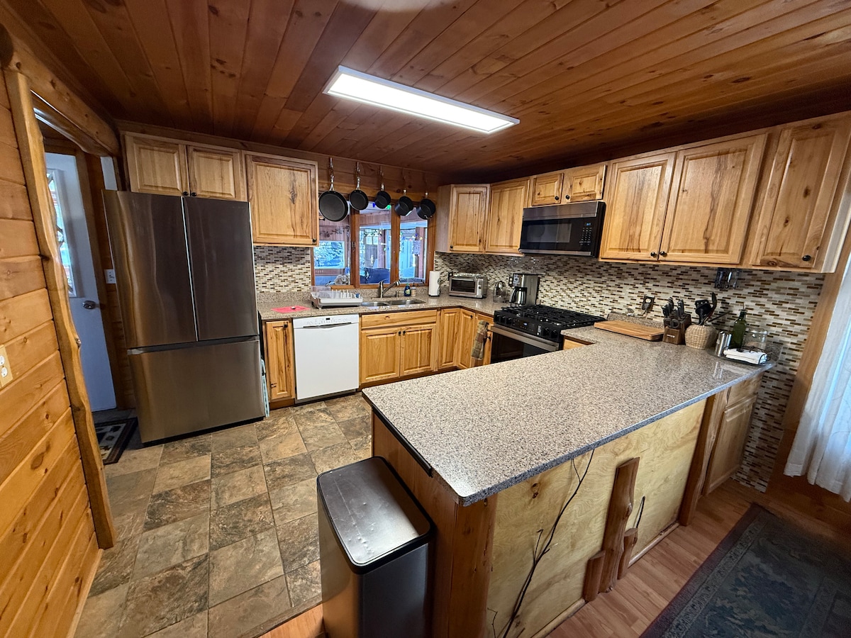 Escape to High Peaks Hideout, a secluded 9 acre property, 10 minutes from Whiteface Mountain. This lovingly restored cabin offers a careful blend of modern comfort and rustic charm. It accommodates 4 comfortably, featuring a lofted king bed and 2 twin beds downstairs. Your mountain retreat awaits! - Luxury hot tub for 4, covered - New custom kitchen with soapstone countertops - Luxury linens - OLED TV with Sonos sound bar and Apple TV - Giant lounge sectional - Custom dimmable lighting