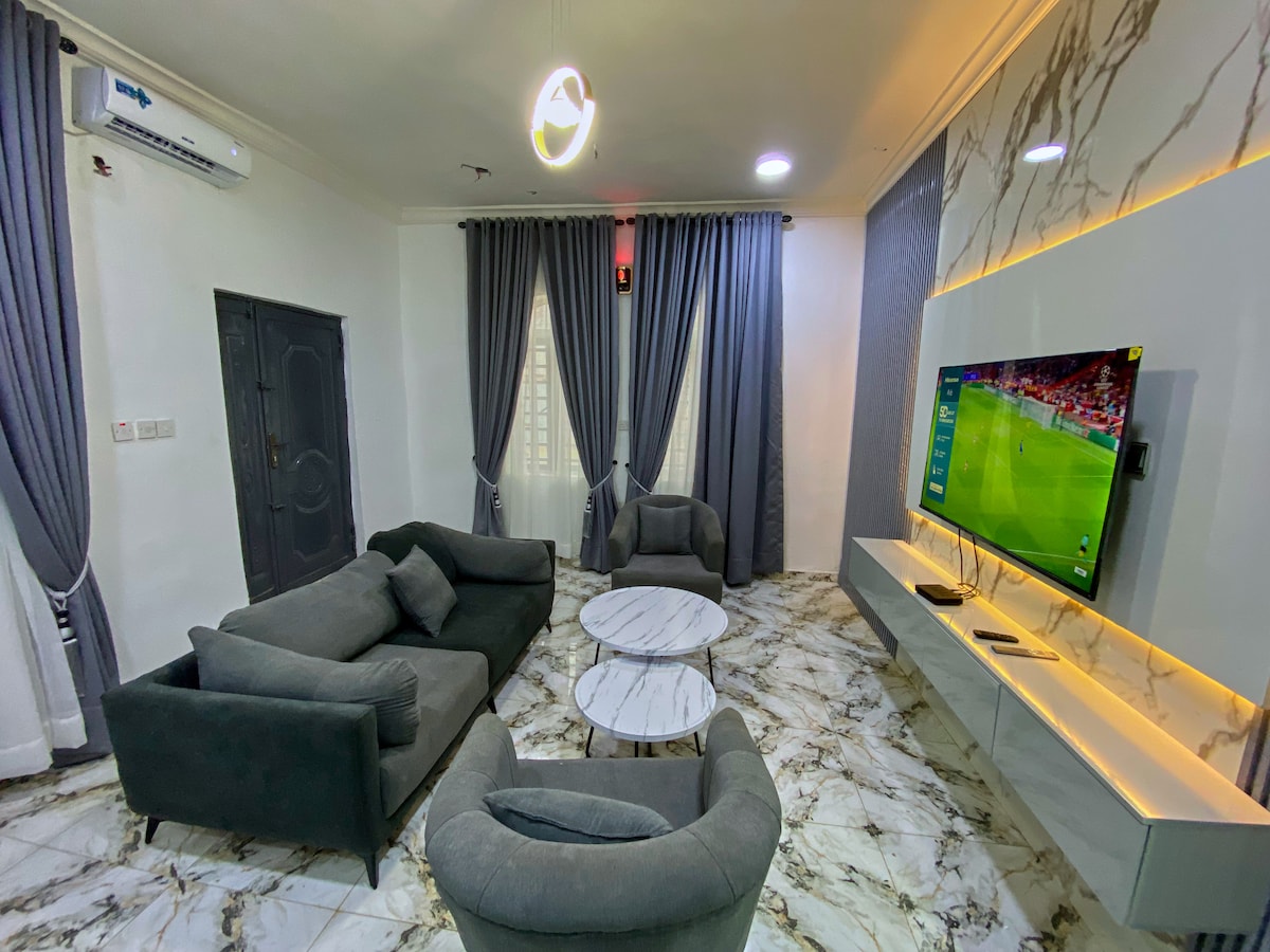 (PROČITAJTE OSTALE INFORMACIJE) (PRATITE NAVOĐENJE PUTEM, NEMAMO KONTROLU NAD NIGERIJSKIM PUTEVIMA.,MOLIMO VAS DA RAZUMETE OVO. HVALA) Zaboravite brige u ovom prostranom i spokojnom apartmanu sa 3 spavaće sobe, sa svim sobama sa kupatilom. Internet konekcija... Klima-uređaji, ventilatori, TV (DSTV), .... (24-časovno osvetljenje, kombinacija mreže Nepa, solarnog sistema (za osnovnu elektroniku) i pomoćnog generatora (na zahtev). Nalazimo se u blizini mnogih restorana i 25 minuta od međunarodnog aerodroma. 24-časovno privatno obezbeđenje.