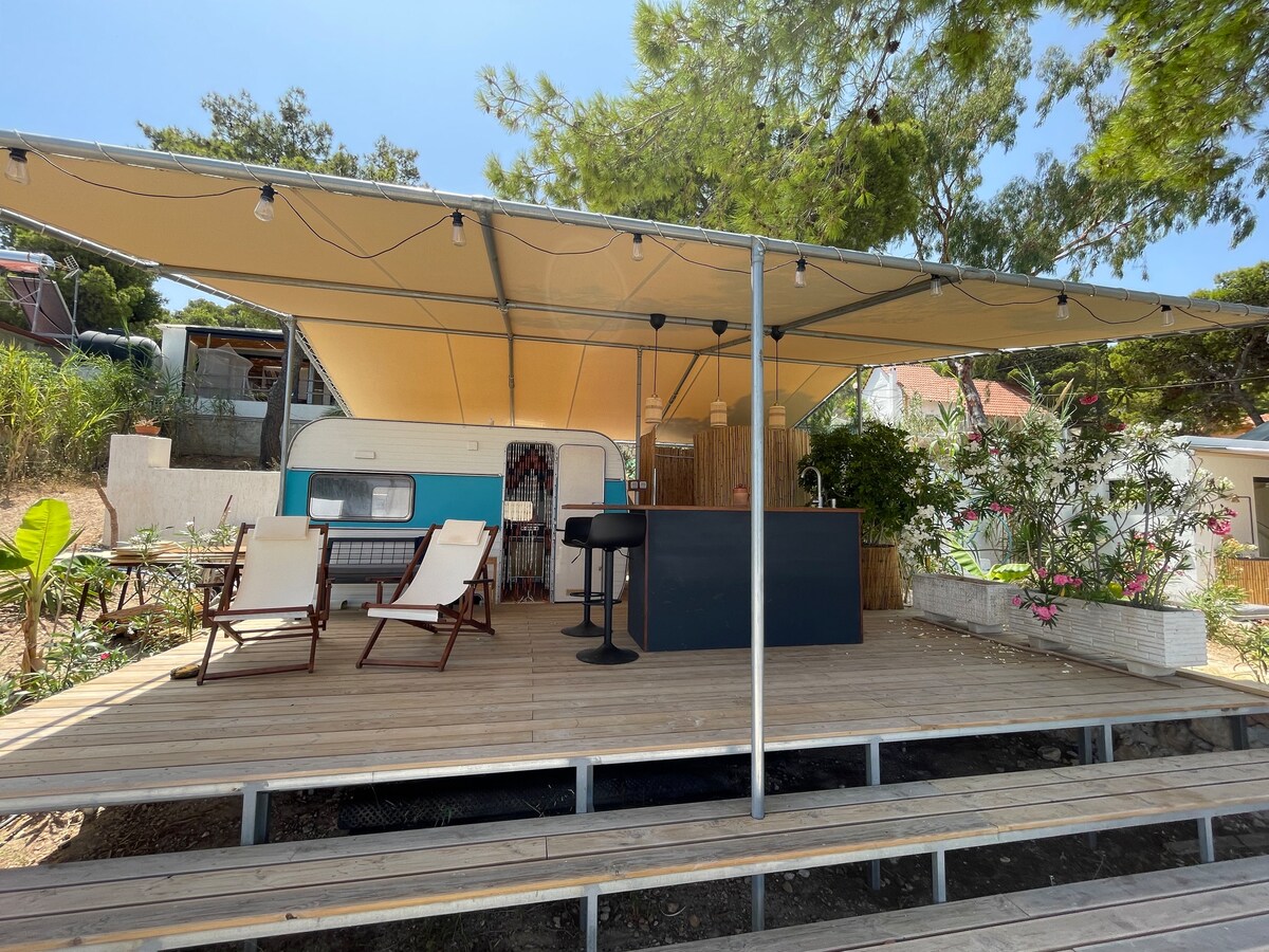 Dobro došli u naš smještaj! Starinski karavan je pažljivo restauriran kako bi pružio vrhunski glamping doživljaj. Samo nekoliko minuta hoda od najbliže plaže, uronjeni ste u prirodu pod borovom šumom, čujete ptice i udišući najčistiji vazduh. Spektakularan pogled na Saronski zaliv učiniće vaš boravak nezaboravnim.