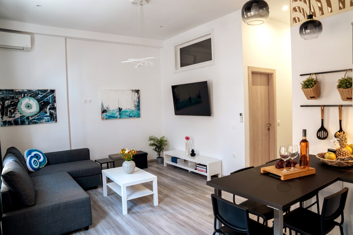 Brand new modern suite, fully furnished. Contains one bedroom with a big double bed and one more bedroom with two single beds, which can be turned to a big double bed (if you place them one beside the other). Each bedroom has a smart TV 32'', an air-condition and a ceiling fan. The living room has a sofa bed, smart TV 55'', air-condition and access to outside open area. The kitchen is fully equipped with a large fridge, oven, coffee - espresso machine and many other electrical appliances.