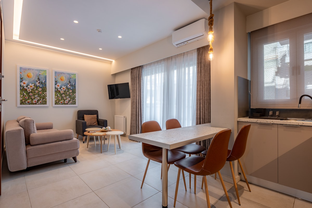 Stan se nalazi u mirnoj četvrti, ali u isto vrijeme vrlo blizu javnog prevoza, prodavnica, kafića i restorana. Njegova lokacija ga čini idealnim za putnike koji žele da istraže Atinu, kao i za one koji žele udoban i opuštajući boravak. Prostor je dizajniran s pažnjom posvećenom detaljima i svim potrebnim sadržajima kako biste se od prvog trenutka osjećali kao kod kuće.