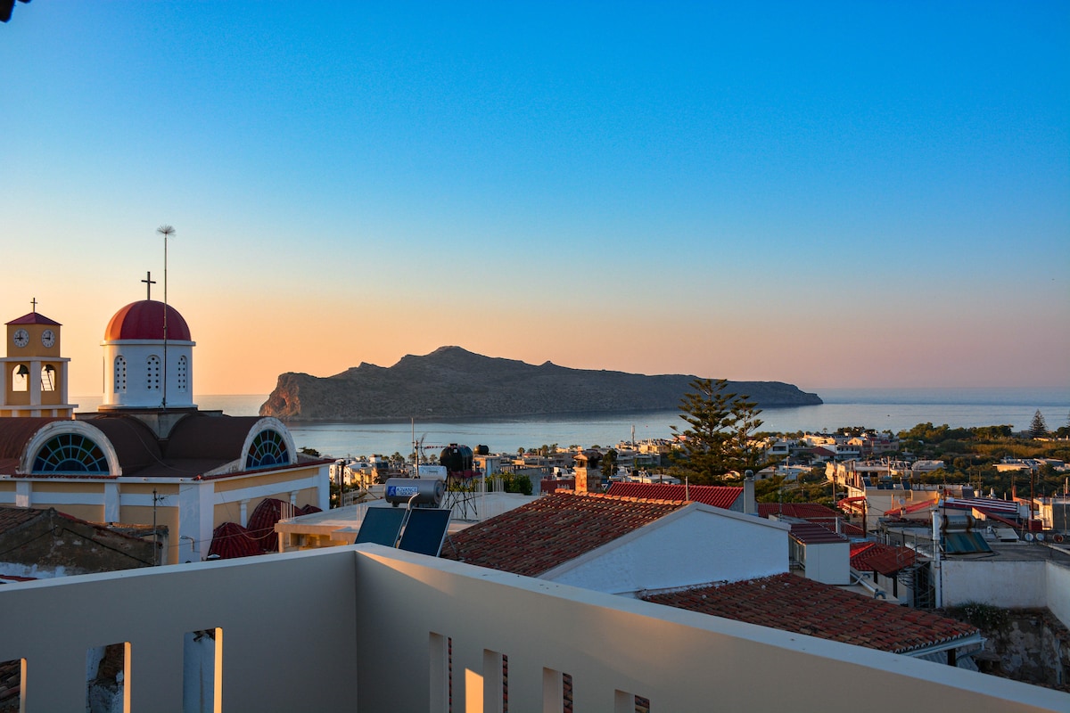 Uživajte u odmoru uz panoramski pogled koji oduzima dah! Ova kuća se nalazi na vrhu brda u tradicionalnom selu Platanias. Ima otvoreni prostor koji se sastoji od dnevnog boravka sa sofom na razvlačenje, potpuno opremljene kuhinje, trpezarijskog stola i kancelarijskog stola, spavaće sobe sa bračnim krevetom, kupatila sa tuš kabinom i dva balkona na kojima možete uživati u nevjerovatnom pogledu na more.