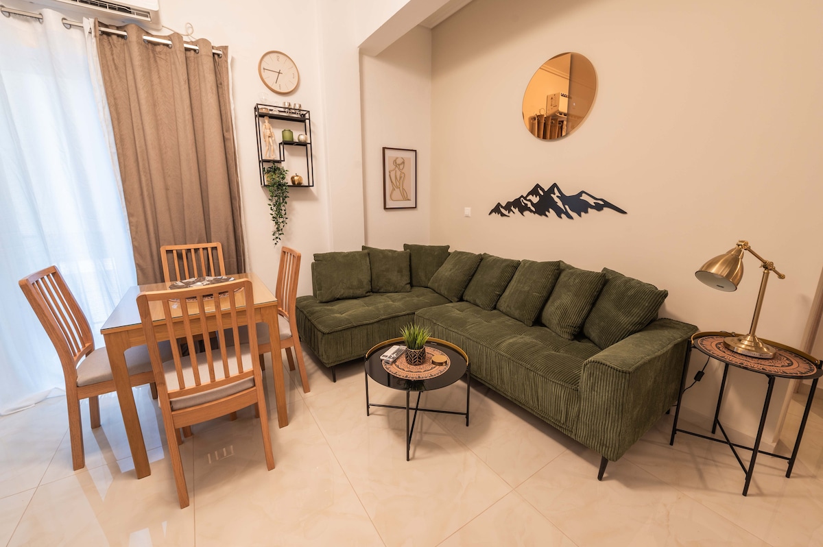 Pobjegnite u Efiin prostor iz snova, luksuznu oazu u zapadnom predgrađu Atine. Uživajte u zapanjujućoj unutrašnjosti od prirodnog kamena, toplog drveta i poliranog mermera. Opustite se u ogromnoj hidromasažnoj kadi i privatnoj teretani. Predivna bašta sa privatnim prostorom za roštilj savršena je za udobne noći. Brzi Wi-Fi je dostupan. Samo 3 stanice metroa udaljene od centra Atine. Nezaboravan boravak je zagarantovan.