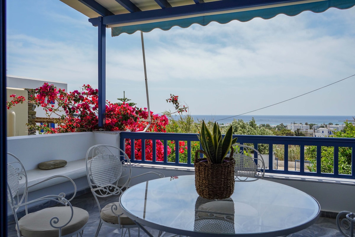 Potpuno opremljen jednosoban apartman sa pogledom na more. Jedan bračni krevet u spavaćoj sobi i 1 kauč u dnevnoj sobi, potpuno opremljena kuhinja (rerna, frižider-zamrzivač, mašina za sudove, 4), kupatilo sa tušem , mašina za veš, privatna terasa sa stolicama i stolom. Pristup zajedničkoj terasi sa direktnim pristupom moru (stijenama) gde gosti mogu da plivaju ujutro. Pogled na prednje more iz dnevnog boravka i spavaće sobe. Nekoliko koraka od centra Ermoupolisa.
