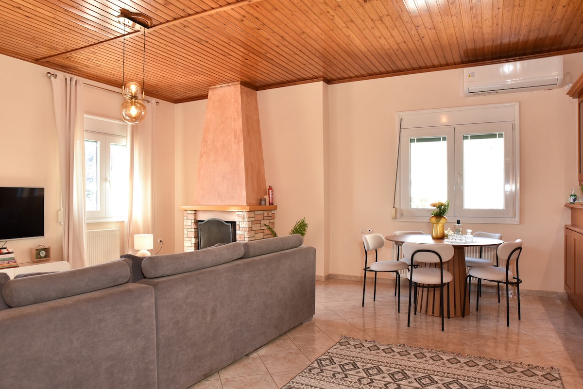 Kuća se nalazi u prelepom selu Neohori. Nalazi se na prvom spratu. Glavna kuća ima veliku baštu sa cvećem i bezbedno je okruženje za decu da se igraju. Kuća ima veliku dnevnu sobu povezanu sa potpuno funkcionalnom i opremljenom kuhinjom (rerna, frižider, aparat za kafu, toster za sendviče,sokovnik). Postoje 2 spavaće sobe sa bračnim krevetima,ormani. Takođe je udobno kupatilo. Kuća ima veliki balkon sa prelepim pogledom. Supermarket i benzinska stanica su bliže.