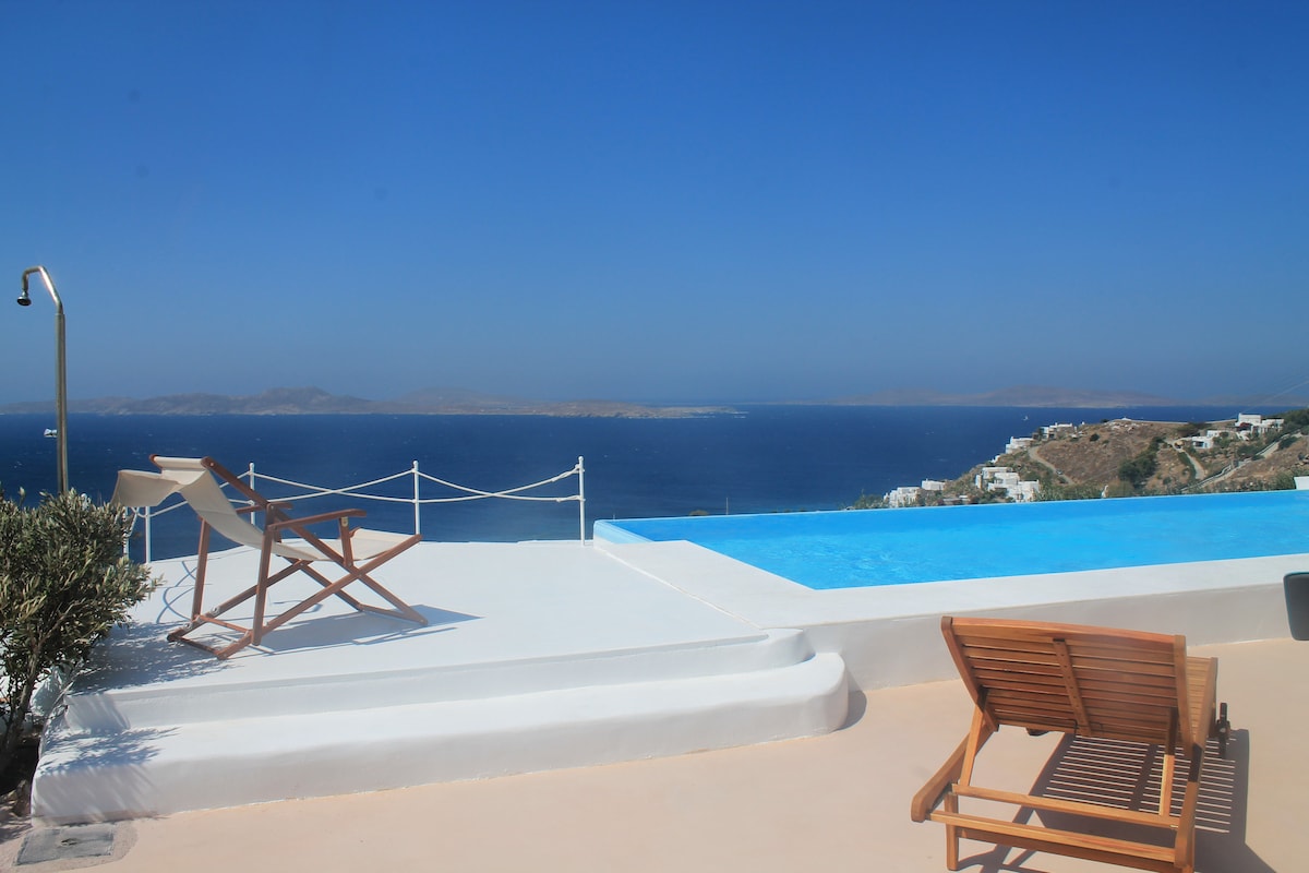 Ovaj novi objekat se nalazi na vrhu brda, sa pogledom na plažu Agios Đanis. Može da primi najviše 4 gosta. Spoljašnji prostor je veoma veliki i privatan Prekrasan beskonačni bazen sa ležaljkama ima neverovatan pogled na Egejsko more i ostrvo Delos. Dok ležite na ležaljkama, imate osećaj da su bazen i more jedno, dok more počinje tamo gde se bazen završava i pruža najneverovatniji pogled na zalazak sunca koji ćete ikada videti u svom životu Više informacija potražite u recenzijama