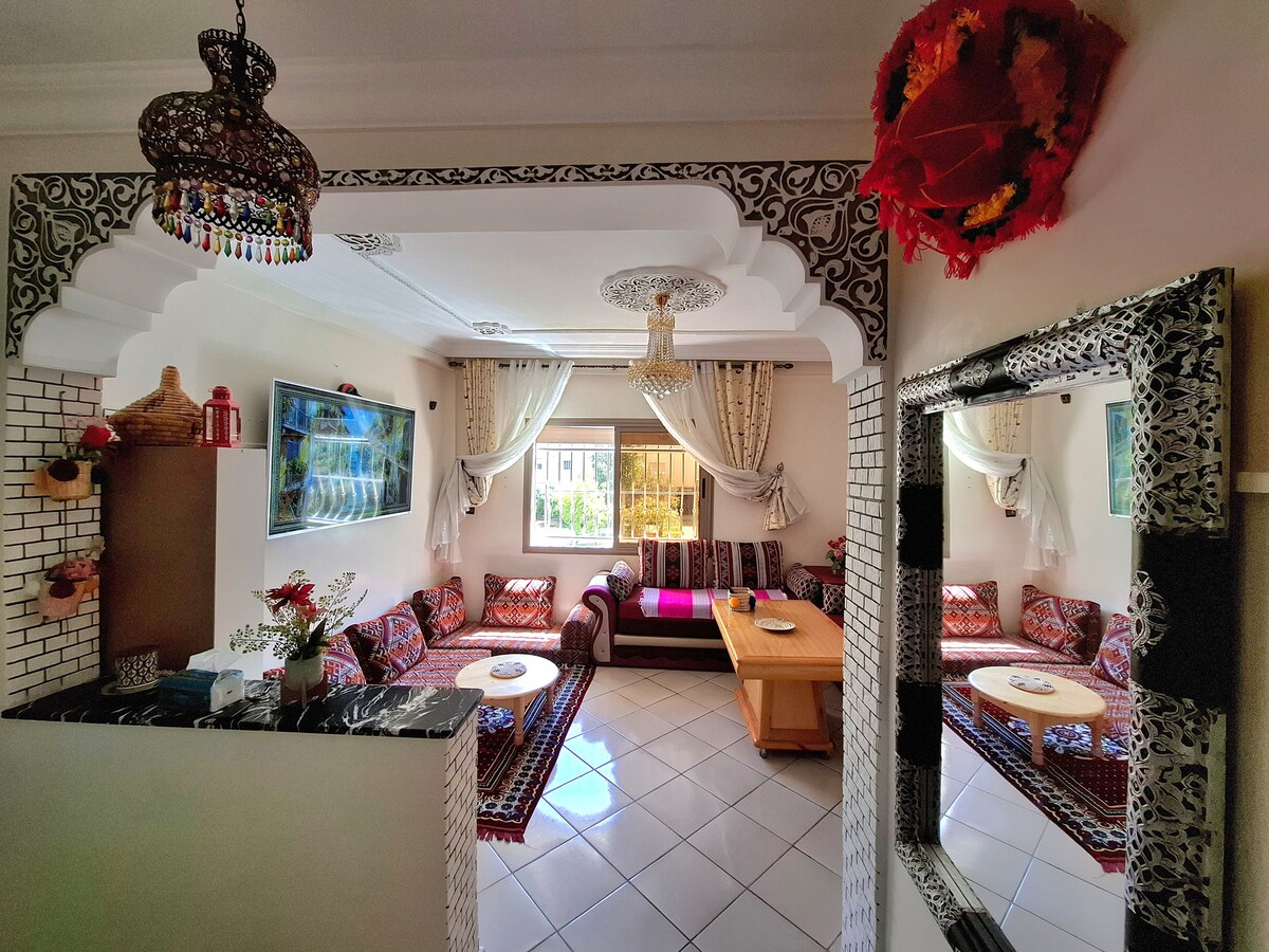 Luxe apartman u rezidenciji Hivernage u području Founti u Agadiru. Vrlo lepa lokacija u najboljoj turističkoj četvrti (plaža na 5 minuta, glavni supermarket na 2 minuta automobilom). Ovaj nedavni stan (2017) se nalazi u rezidenciji sa velikim baštama i nekoliko bazena. Postoje 2 spavaće sobe (jedna sa velikim bračnim krevetom, a druga sa dva kreveta). Jedno kupatilo, potpuno opremljena kuhinja i dnevni boravak sa ravnim televizorom i Wi-Fi mrežom. Tu su i dve terase.