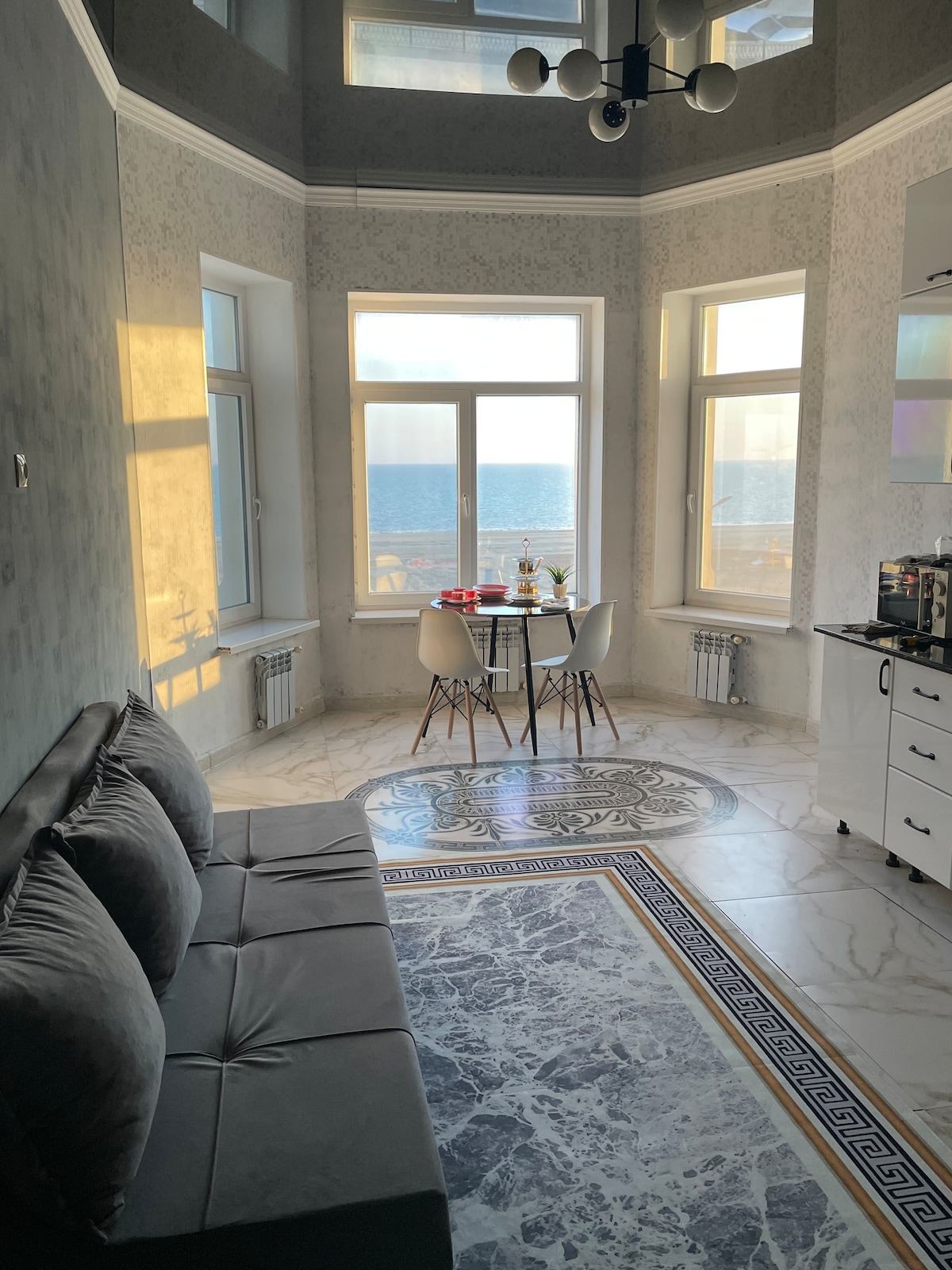 Uživajte u elegantnom doživljaju u srcu grada sa panoramskim pogledom na more. Luksuzni stanovi u stilu modernog minimalizma (crni stanovi) na prvoj liniji u centru grada na centralnom nasipu ,u klasičnoj galerijskoj kući Aktau izgrađenoj 90-ih nalazi se lift. U blizini se nalaze prodavnice, restorani, kafići, tržni centri,nasip itd. Stan ima sve što vam treba za udoban boravak. Jedinstvenost - trpezarija i spavaća soba s pogledom na more, bračni krevet Depozit od 10.000 tenge