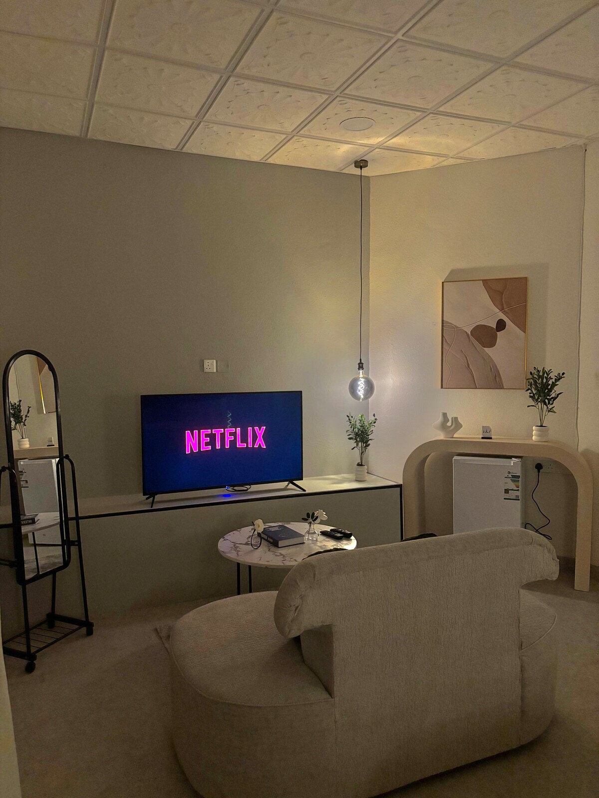 The perfect place for travelers featuring: An elegant living room with a smart TV 1 master bedroom 1 bedroom- two single beds kitchen A dining table with3 chairs + bathrooms (floor chair toilet | Western- style toilet) Outdoor area: A ground seating area A green lawn 🌿 A car entrance 🚘 Swimming pool🏊🏻♂️