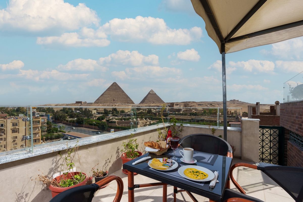 Velika dvokrevetna soba s bračnim krevetom i privatnim balkonom okrenuta prema piramidama (4. sprat). Soba uključuje klima-uređaj, TV, frižider, kuvalo za vodu, kao i besplatnu kafu, čaj i vodu (besplatna pegla na zahtjev). Kupatilo uključuje peškire, fen za kosu i besplatan šampon, sapun i gel za tuširanje. U cijenu je uključen domaći egipatski doručak koji se svakodnevno priprema i poslužuje na krovu od 8 do 10 sati