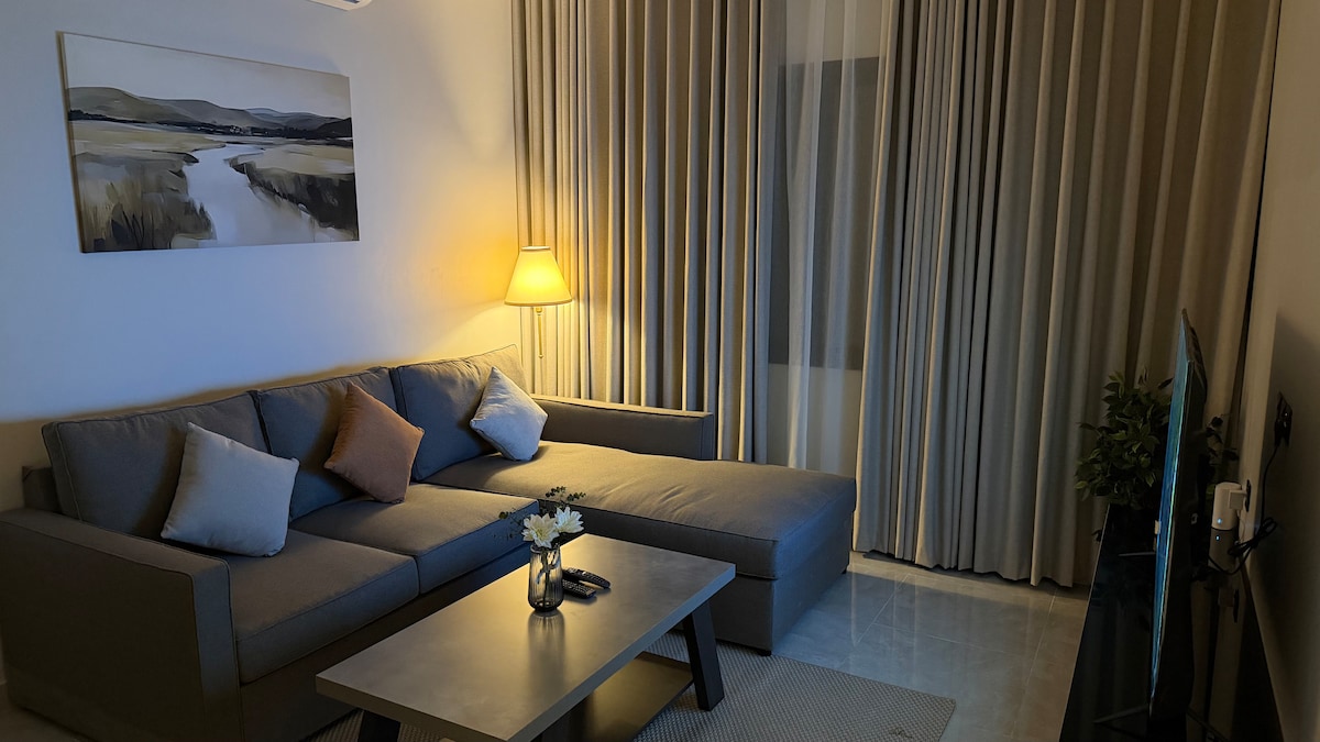Moderan apartman sa privatnim balkonom U blizini Bahreinskog mosta Korniš je udaljen 10 minuta Ekran od 65 inča sa Netflix-om Brzi internet Samostalni ulazak Kontaktirajte nas za popust povodom otvaranja