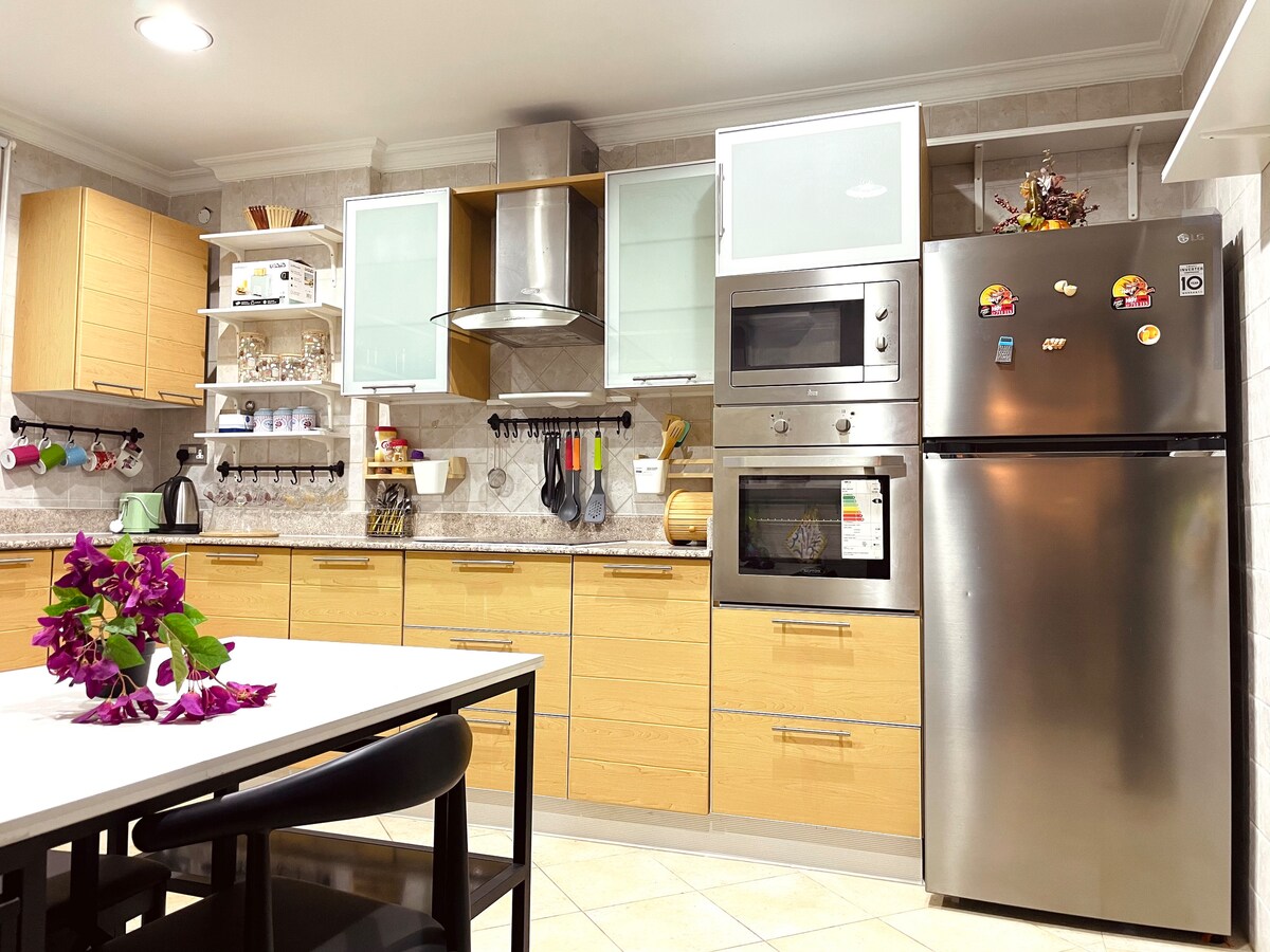 Topao savremeni dvosoban stan u porodičnoj zgradi sa gostoljubivim osobljem, uslugom čišćenja i 24-satnom uslugom obezbjeđenja i recepcije. Prikladno za djecu i bebe. 3 minute hoda će vas odvesti direktno do međunarodnih kafića, restorana, supermarketa koji radi 24 sata, terena za veslanje i još mnogo toga kada odsjednete u ovom smještaju u srcu koji se nalazi u centru grada (Busaiteen). 5 min vožnje do Avenije -10 min vožnje do aerodroma - 10 min vožnje do srca Maname.