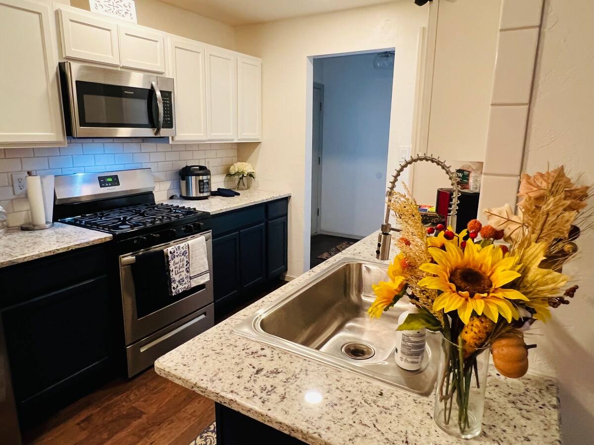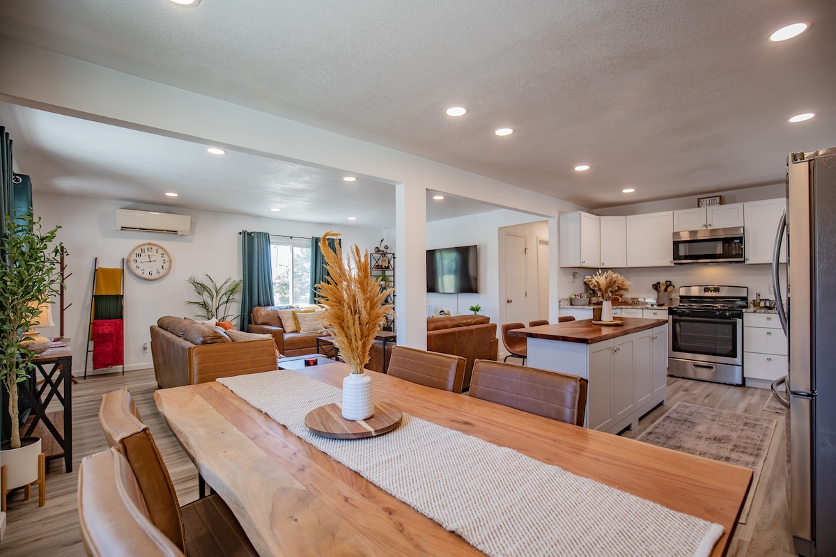 Centralno smješten 4br/2bth dom u mirnom komšiluku za vašu grupu ili porodicu; opustite se u izboru 2 bračna kreveta (King) ili 2 bračna kreveta (1,4x2). Okupite se u igraonici sa stolom za poker, pametnim televizorom od 55inča, stolom za video igre, električnom gitarom i amperom, aparatom za kokice, frižiderom za piće, društvenim igrama i kompletnim postavkama bara. Otvoreni raspored omogućava svima da kuvaju, jedu ili gledaju film na 65-inčnom pametnom televizoru zajedno. Opustite se na natkrivenom dvorištu sa zavesama za hladovinu i sedišta za sve, kao i na plinski roštilj.