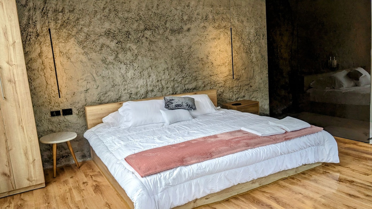 Tih i elegantan prostor. Pametna soba od 72 m² sa prostranim zelenim površinama. Elegantno: stakleni zidovi, dekorativna rasvjeta, TV na daljinsko uvlačenje, bračni krevet, panoramska tuš-kada, hidromasažna kada, crna zavjesa i japanska prodavnica namještaja. Mirno: prednja šuma, veliko područje s prirodnom travom, bočni vrt s biljkama i japanskom bočnom baštom, terasa uz zalazak sunca, posmatranje ptica, praksa meditacije, joga, krioterapija i pješačenje po vatri.