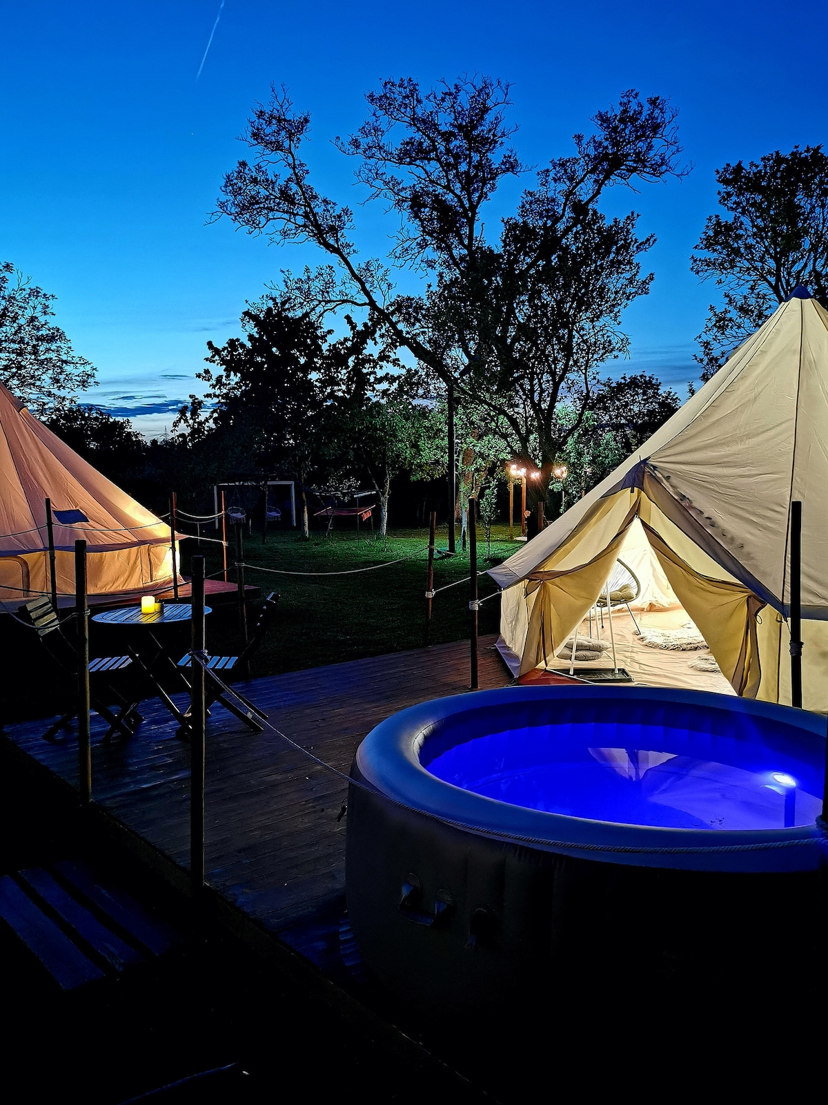 The Apple tent within Green Garden Glamping Retezat is a glam tent where you experience the comfort of a classic stay in the middle of nature. Privatni đakuzi koji se nalazi na terasi šatora nudi vam jedinstvene trenutke opuštanja i maženja usred prirode. Klima-uređaj takođe omogućava da tokom vrućih ljetnjih dana uživate u udobnosti. Da bi vaš doživljaj bio potpun, pripremili smo čajnu kuhinju, 3 sjenice, ognjište, viseće ležaljke i ljuljačke. Otkrijte luksuz glampovanja u Apple šatoru