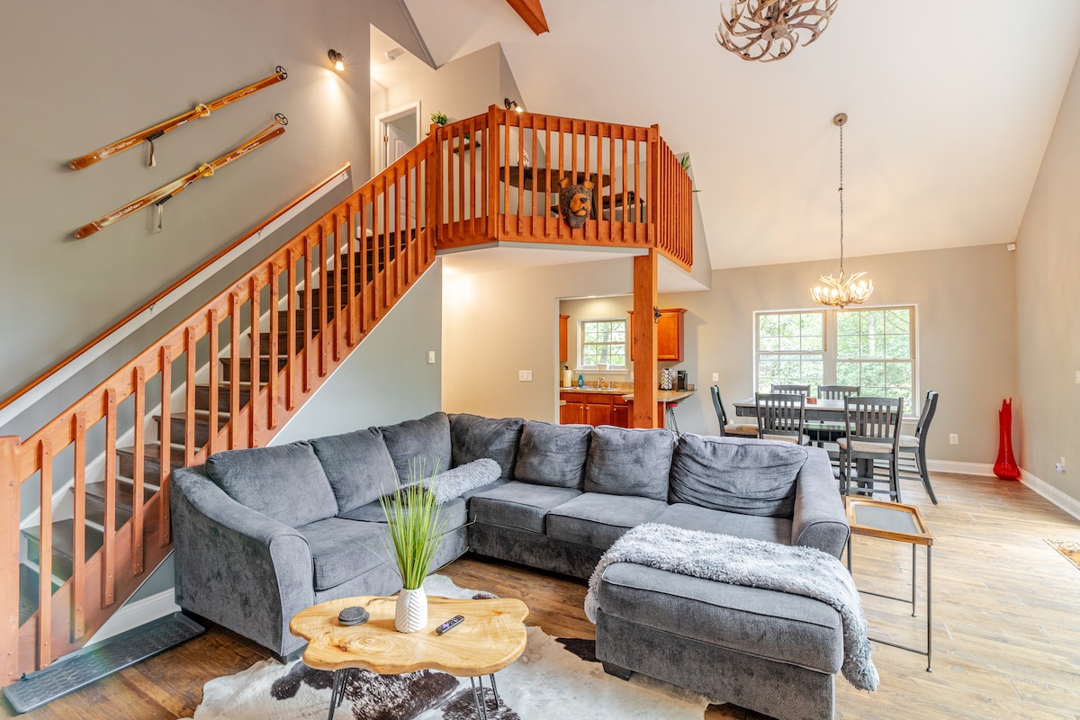 🎱 Bilijarski sto 🍽️ Trpezarijski sto za 16 osoba 🥅 Vazdušni hokej 🔥 Kamin na drva 🏓 Stolni tenis 🥩 Weber plinski roštilj ⚽️ Stolni fudbal 🏡 279 m² 🚴♂️ Peloton 🪵 Ognjište u dvorištu ★ Aromatična sauna od kedrovine za 6 osoba ★ Odvojena trpezarija i dnevna soba ★ Predsoblje za vašu opremu za golf i skijanje ★ Sunčana prednja terasa s pogledom na šumu ★ Osamljena parcela od 2 jutra (0,8 hektara) ★ 4 spavaće sobe + potkrovlje za spavanje ❄️ Na vratima skijališta „Jack Frost“ ❄️