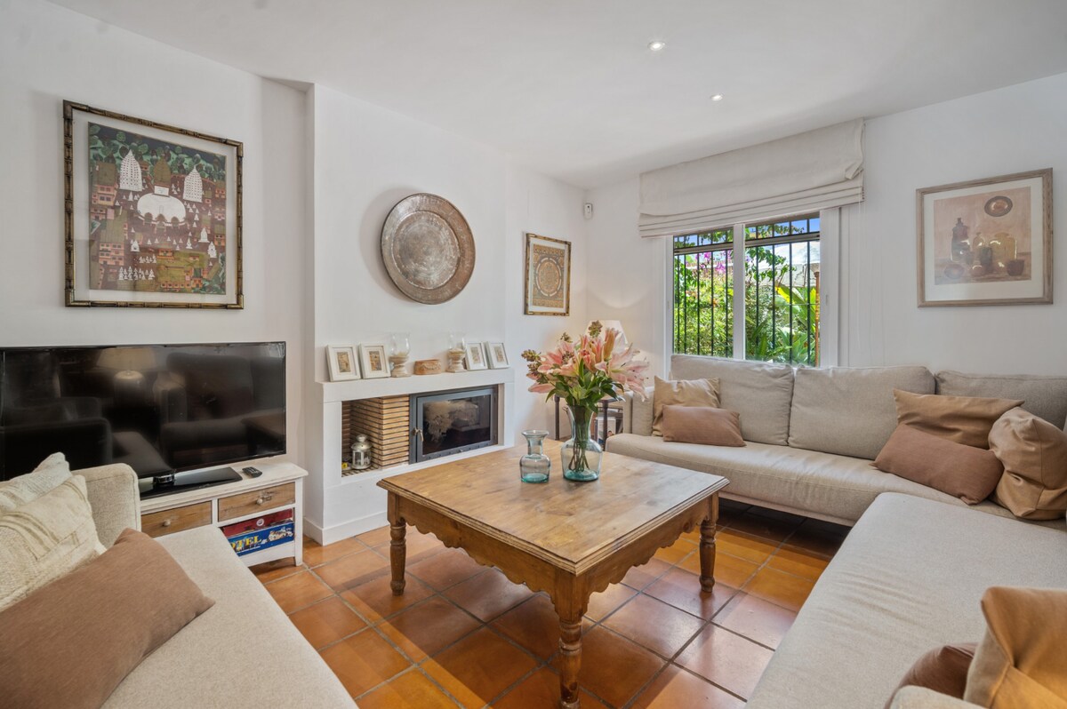Dobro došli u raj!! Vila bez premca, sa ličnošću i punom svjetla, na jednom spratu, sa velikom baštom, čvrstim bazenom, roštiljem, kaminom, samo 3 minuta hoda od jedne od najboljih plaža u Marbelji i čiringuitosu, opremljena svim vrstama detalja, 300 metara od javnog prevoza, pola sata od aerodroma i 10 minuta do centra Marbele