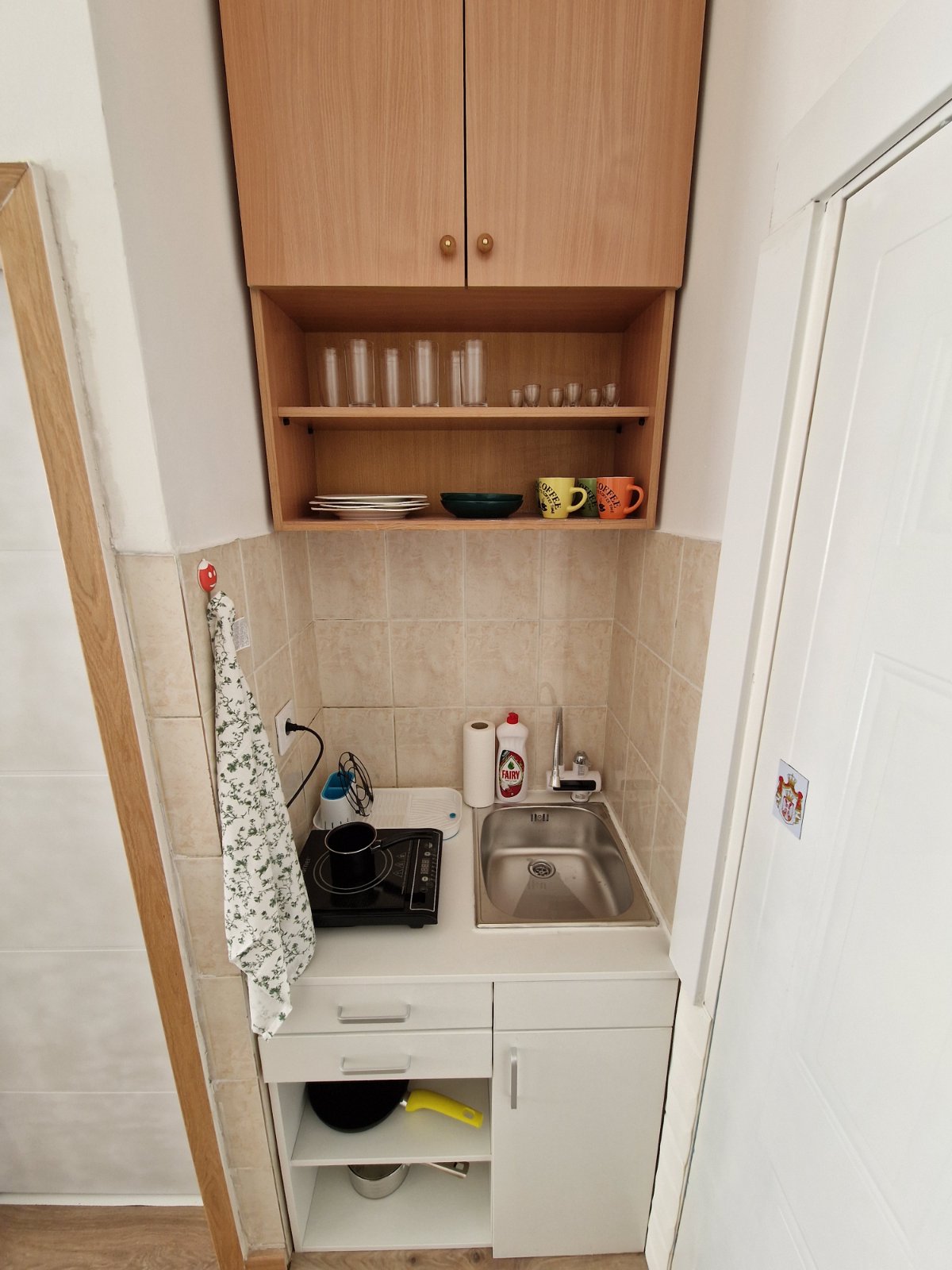 Udobna garsonjera u mirnoj četvrti Beograda, u blizini centra. U njega se udobno mogu smjestiti dvije osobe. Sadrži jedan osunčani dnevni boravak zajedno sa potpuno opremljenom kuhinjom i kupatilom.