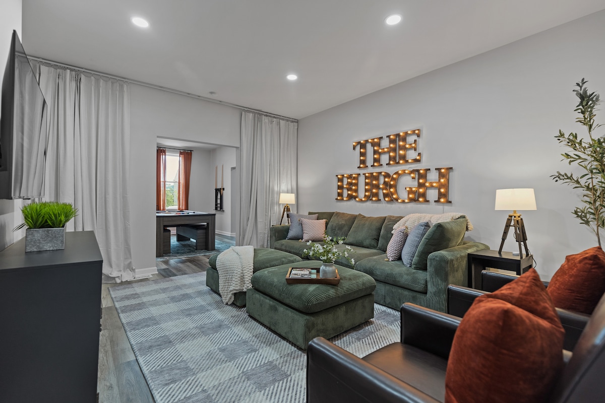 Vau! Uživajte u šarmu Pitsburga u ovom otmjenom domu sa spektakularnim pogledom na centar grada, smešten na mirnom brdu na idealnoj lokaciji, nedaleko od obližnjih atrakcija. Odlična kombinacija profesionalnog dizajna i modernih sadržaja čini ovaj smještaj savršenim mjestom za boravak, bilo da putujete poslovno ili privatno. 6 minuta vožnje do planine Vašington 9 minuta vožnje do Konzervatorijuma i botaničke bašte Phipps 9 minuta vožnje do parka PNC
