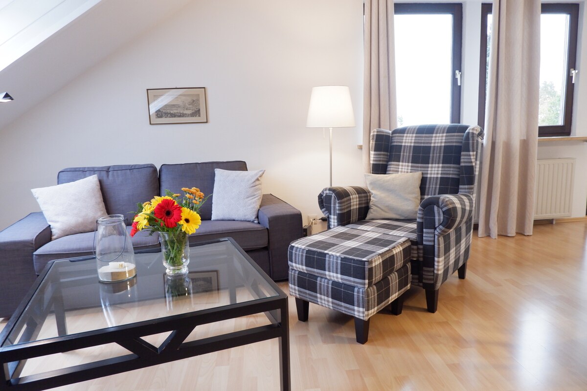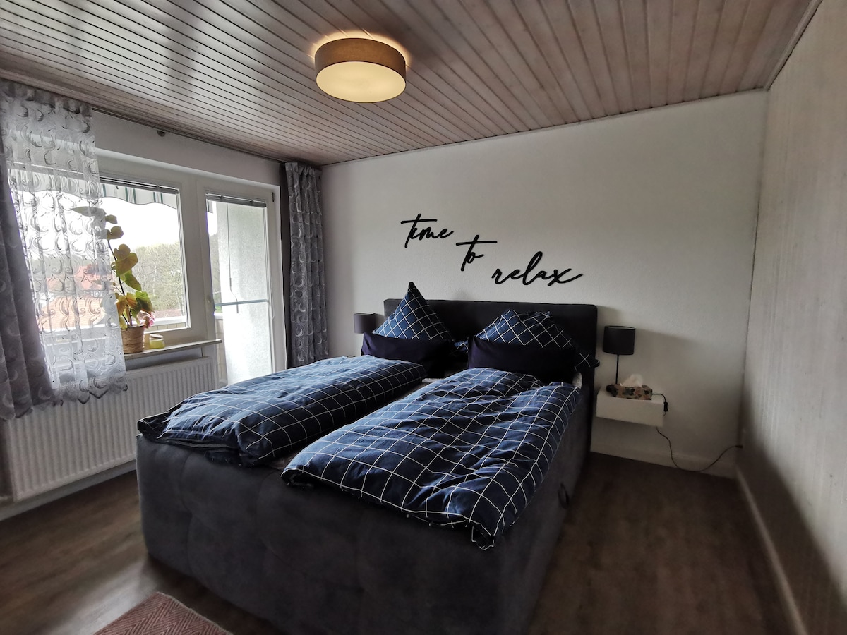 Hell und stilvoll eingerichtetes kleines Apartment für 1-2 Personen mit Doppelbett, Pantryküche, Smart-TV und WLAN. Privatparkplatz, E- Bike- Stellplatz im Keller und nur ca. 100 m zum Hausherzberger Teich. Perfekt für Naturfans: Wandern, Radfahren, Langlauf, Schwimmen - alles Fußläufig oder schnell erreichbar. Nichtraucherwohnung. Bettwäsche und Handtücher inklusive.