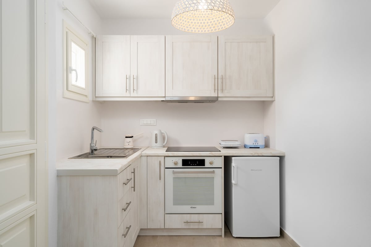 Stan u prizemlju tradicionalnog kikladskog stila, u srcu naselja Parikija. Idealno smešten, nudi mir i opuštanje, kao i pogodnu centralnu lokaciju. U pješačkoj udaljenosti: sve zanimljive znamenitosti (stara pijaca, frankski dvorac), pekara, prodavnice. More je udaljeno nekoliko metara od kuće, a za 2 minuta možete doći do morske ulice, gde možete uživati u pogledu na zalazak sunca. Luka, autobuska stanica i taksi stajalište udaljeni su 3 minuta hoda.