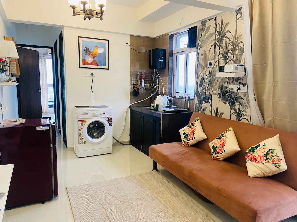 A centrally located 1 BHK apartment in Goregaon West Mumbai with metro station right on the door step. Nearby places include NESCO Centre, Infinity Mall Inorbit Mall, Lokhandwala. Only 10Kms from International airport with excellent east to west connectivity. Elegantly styled with friendly vibes furnished with all amenities for long and comfortable stay. Best suited for Families, corporates and crisp work stays. A fully equipped kitchen with optional househelp for home cooked meals and cleaning.