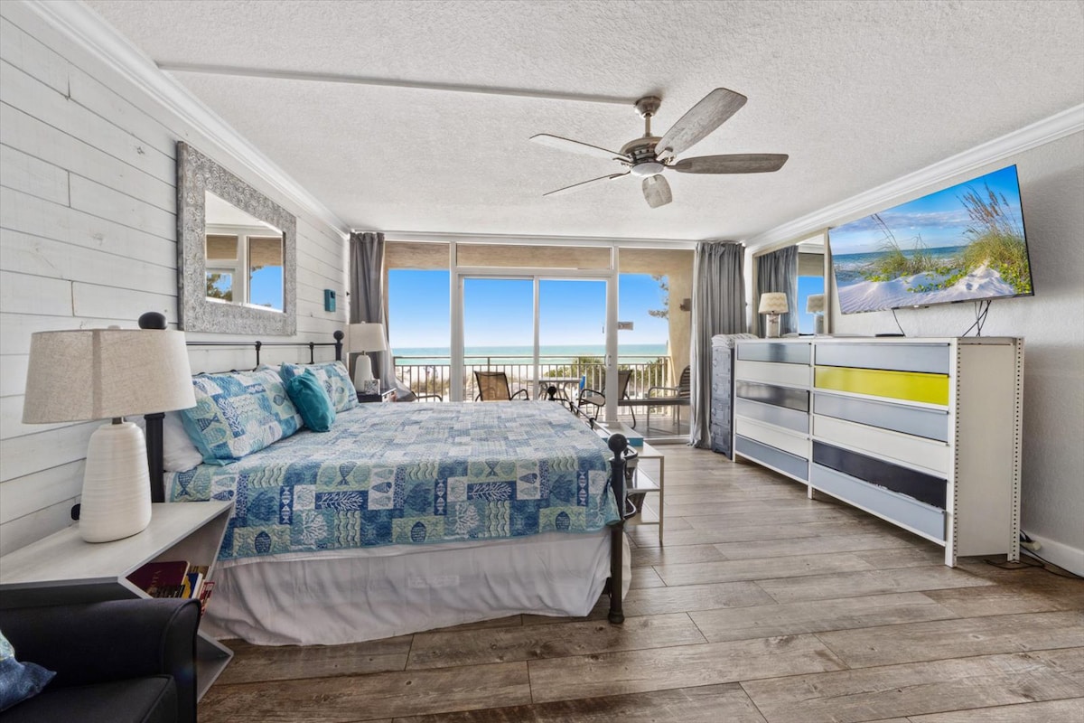 ONE SHELL COVE on Anna Maria Island has been fully remodeled after Hurricanes Helene and Milton. Predivan studio tlocrt sa sjajnom kuhinjom. Prekrasan pogled na talase i plažu ispred vašeg prozora. Uzmite peškir, napravite nekoliko koraka i već ste na plaži. Pijesak dolazi do vaših vrata u ovoj prizemnoj jedinici. Nevjerovatna lokacija Prošetajte do nekih restorana Besplatna kolica idu gore-dole po ostrvu Iznajmite kajake i daske za veslanje i uživajte na plaži