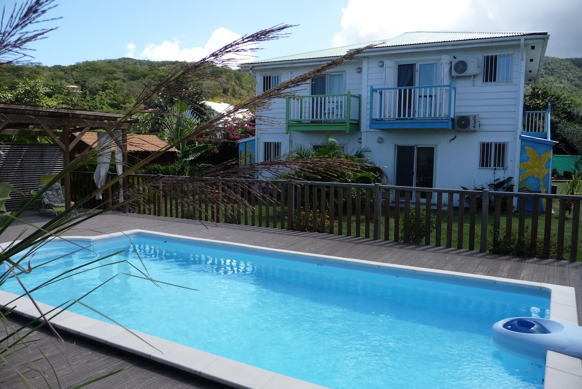 Idealna za otkrivanje zavjetrine obale, ova seoska kuća nalazi se 500 metara od mora i staze obilježene najljepšim plažama Gvadalupa🌴 Pored unutrašnjih sadržaja (krevet od 160 cm, kompjuter/prostor za presvlačenje, dobro opremljena kuhinja), uživaćete u estetici kreolske bašte sa svoje privatne terase ili iz zajedničkog bazena (2 smještaja za 2 osobe) 🐠 U ovom okruženju žive psi, mačke, kolibriji, konji... Slatki i druželjubivi 🥰 Ideje za velnes i otkrivanje po dolasku 🤗