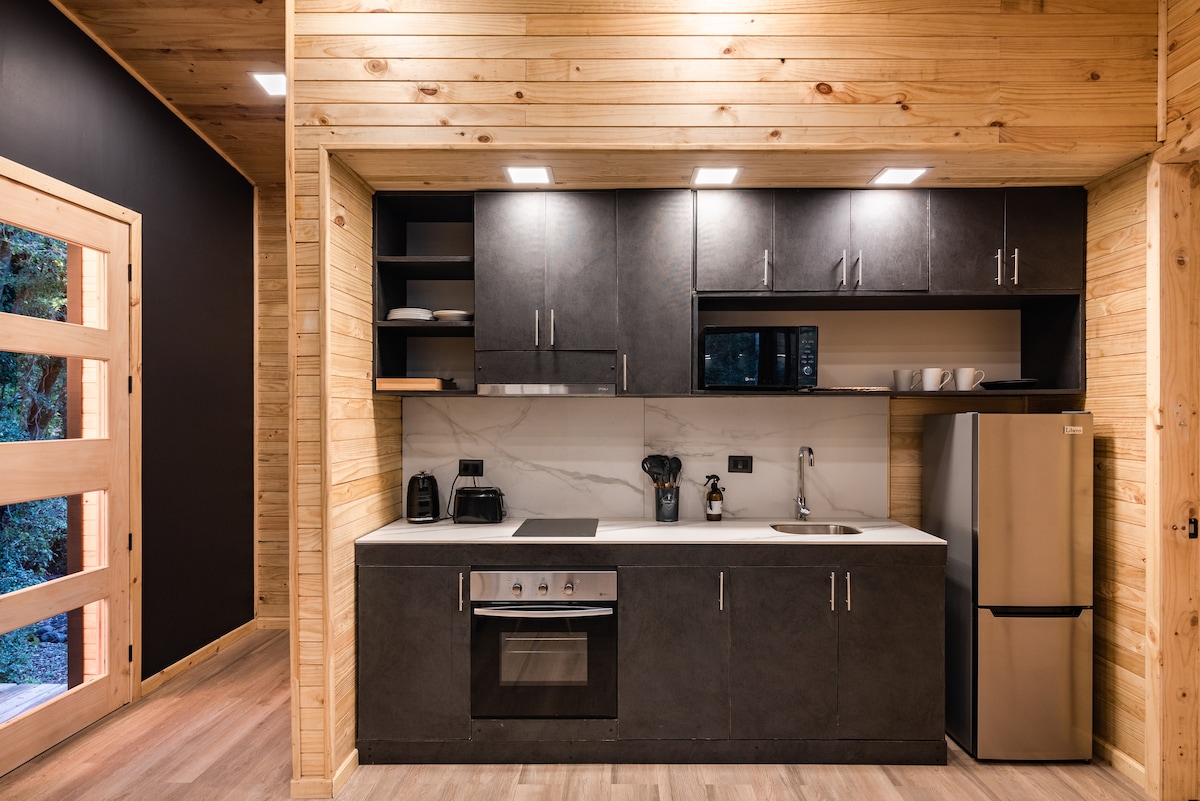 Conecta con la naturaleza y ven a conocer el bosque nativo de Pucón con todas las comodidades que necesitas. Cuenta con: * 2 habitaciones, en el dormitorio principal: cama matrimonial y cama adicional (optativa). Segundo dormitorio: 2 camas individuales. * Cocina equipada * Aire acondicionado y estufa a pellet * Tinaja para 4 o 5 personas * Directv premium * Estacionamiento privado * Lugar tranquilo y seguro. *Estamos ubicados a tan sólo 12 km de Pucón y 10 km del Lago Caburgua*