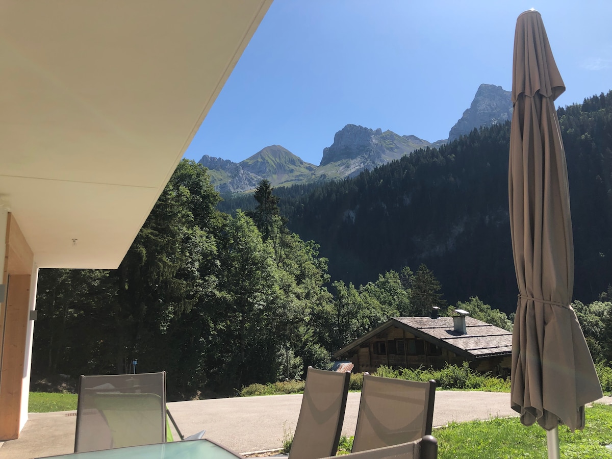 Stan površine 60 m2 u prizemlju u drvenoj planinskoj kući Savoyard. Spava 4 (maksimalno 6 sa kaučem na razvlačenje); Potpuno opremljen, u blizini skijaških staza nizbrdo autobusom: stanica za prevoz udaljenom 100 m, a zatim 4 kilometra od podnožja padina. 100 ml od brda za skijaško trčanje; golf udaljen 300 metara. Mirna mesta okružena planinama, livadom, šumom i rekom. Obezbeđena posteljina i peškiri za ruke. Skijaška soba i skladište: +20 m2. Terasa i bašta idealna su za decu.
