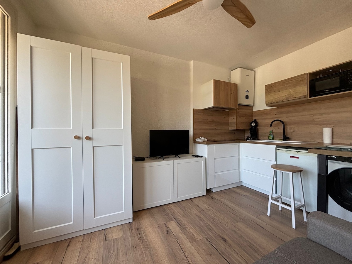Ibica ili Kikladska atmosfera za ovaj F2 stan potpuno renoviran sa veoma prefinjenom modernom dekoracijom. Poziv za putovanje i promena ambijenta su zagarantovani. Nalazi se u hiper centru Canet-Plagea, uz more, 6. i gornji sprat, terasa od 15 m2 otvorenog neba...izvanredan pogled na more. Studio soba sa pogledom na more, velika kuhinja, kupatilo, zasebna WC šolja. Wi-Fi, klima-uređaj, udobnost. Uključena je značka za parkiranje, obezbeđena po dolasku. Bezbedan parking na 50 metara, Place Méditerranée.