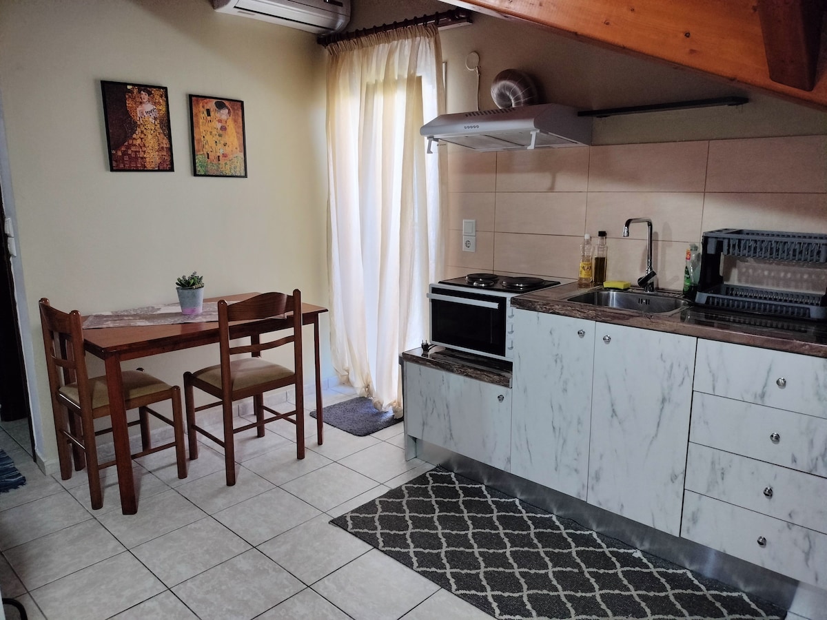 Naše potkrovlje se nalazi na gornjem spratu šarmantne gostinjske kuće Cavos Inn, u živopisnom selu Assos, samo 5 minuta hoda od plaže. Dizajniran da pruži besprekornu mješavinu udobnosti i stila, sa bračnim krevetom, potpuno opremljenom kuhinjom, kupatilom i dnevnim boravkom u jednom prostoru, sa prelijepim pogledom sa prozora na Mirtos Bej i Asos. Imajte na umu da nema balkona. U svakom trenutku možete da se opustite na glavnoj terasi i uživate u veličanstvenom pogledu koji se pruža pred vama.