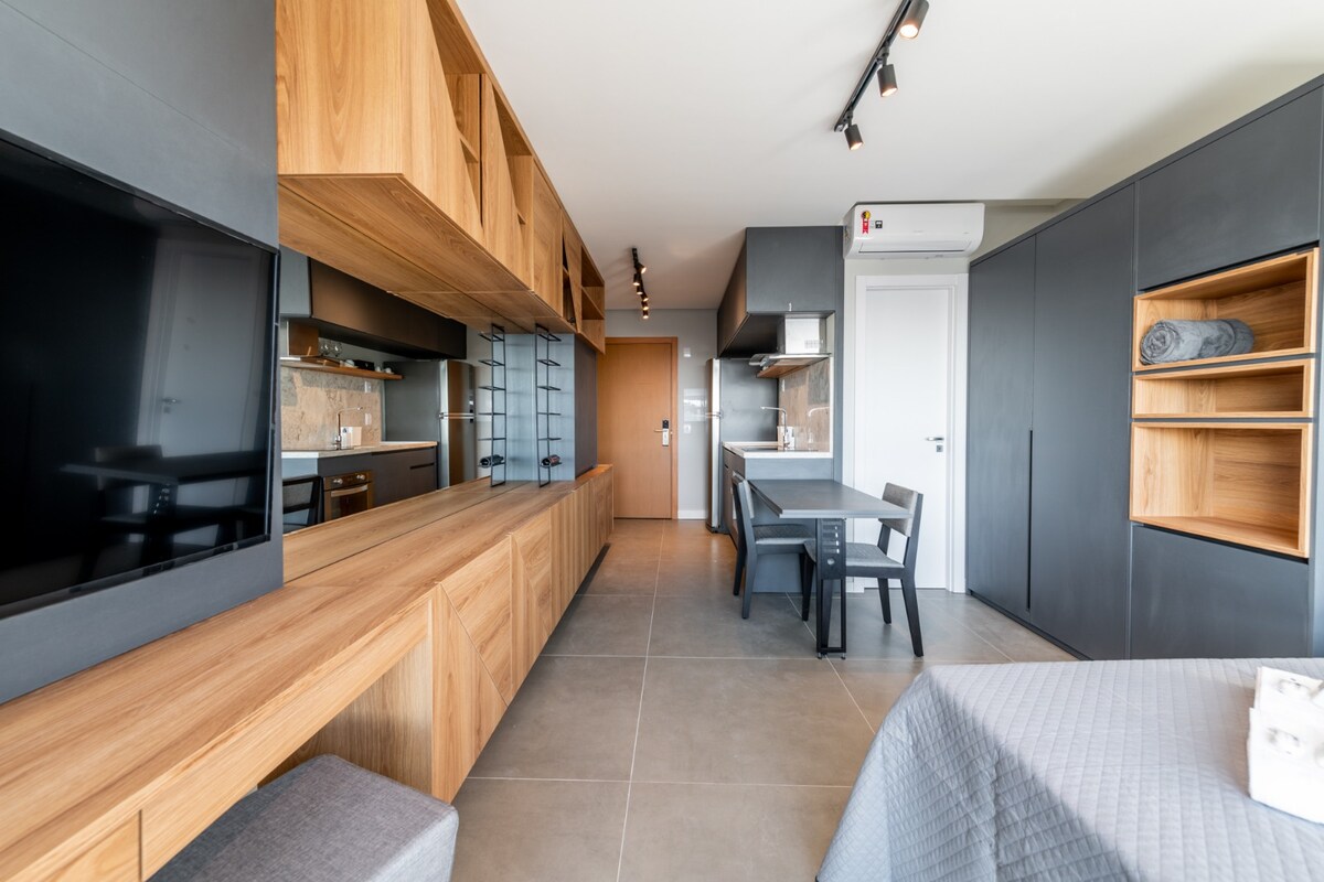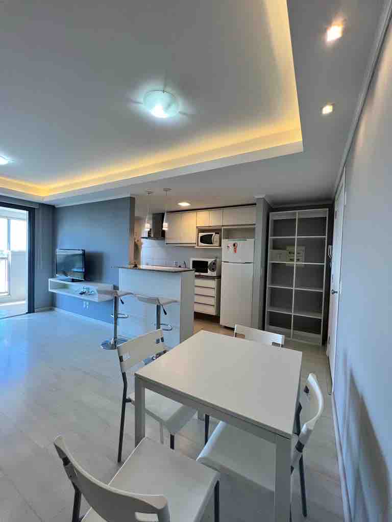 ✨ Estúdio de luxo 📺 SmartTV 55" + ❄️ ar-condicionado 🛋️ Decoração sofisticada e ambiente aconchegante 🏊♂️ Piscina, 🏋️♀️ academia, 🛒 mercadinho e 🌇 terraço com vista incrível 🛏️ Acomoda até 3 hóspedes (colchão extra) 🍳 Cozinha completa: forno, cristaleira, torradeira, panelas, fogão 4 bocas, tábua de corte, mesa de jantar dobrável **(forno superior removido) 📶 WiFi e armário com guarda-chuva ☔ 🚿 Banheiro com ducha quente, toalhas e taças de vinho 🍷 🛡️ Portaria 24h + estacionamento