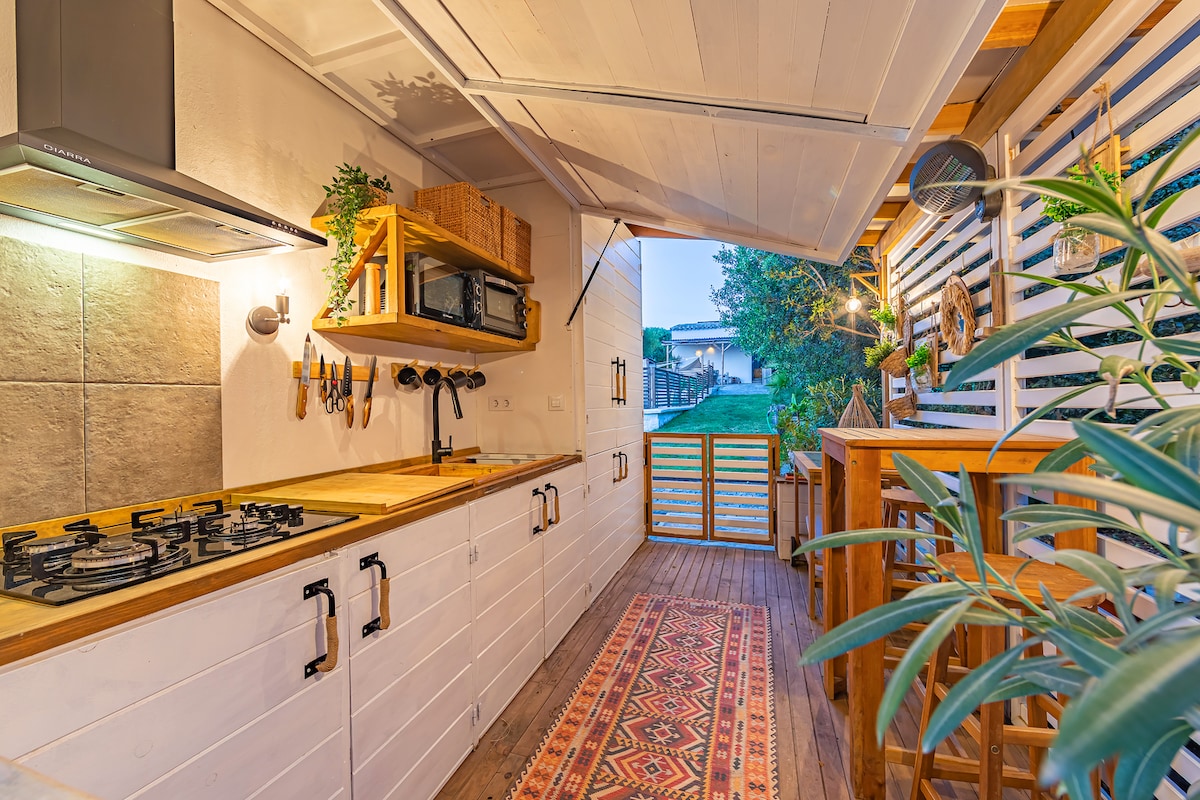 Smještaj inspirisan ostrvom samo 5 minuta od plaže Opustite se u ovom privatnom smještaju natopljenom suncem s bazenom, palmama i šarmantnom kuhinjom na otvorenom sa rernom na drva. Prirodni materijali, minimalistički stil i mirna atmosfera — sve to na samo 5 minuta hoda do plaže. Savršeno za parove, porodice ili bilo koga ko želi da se opusti sa stilom.