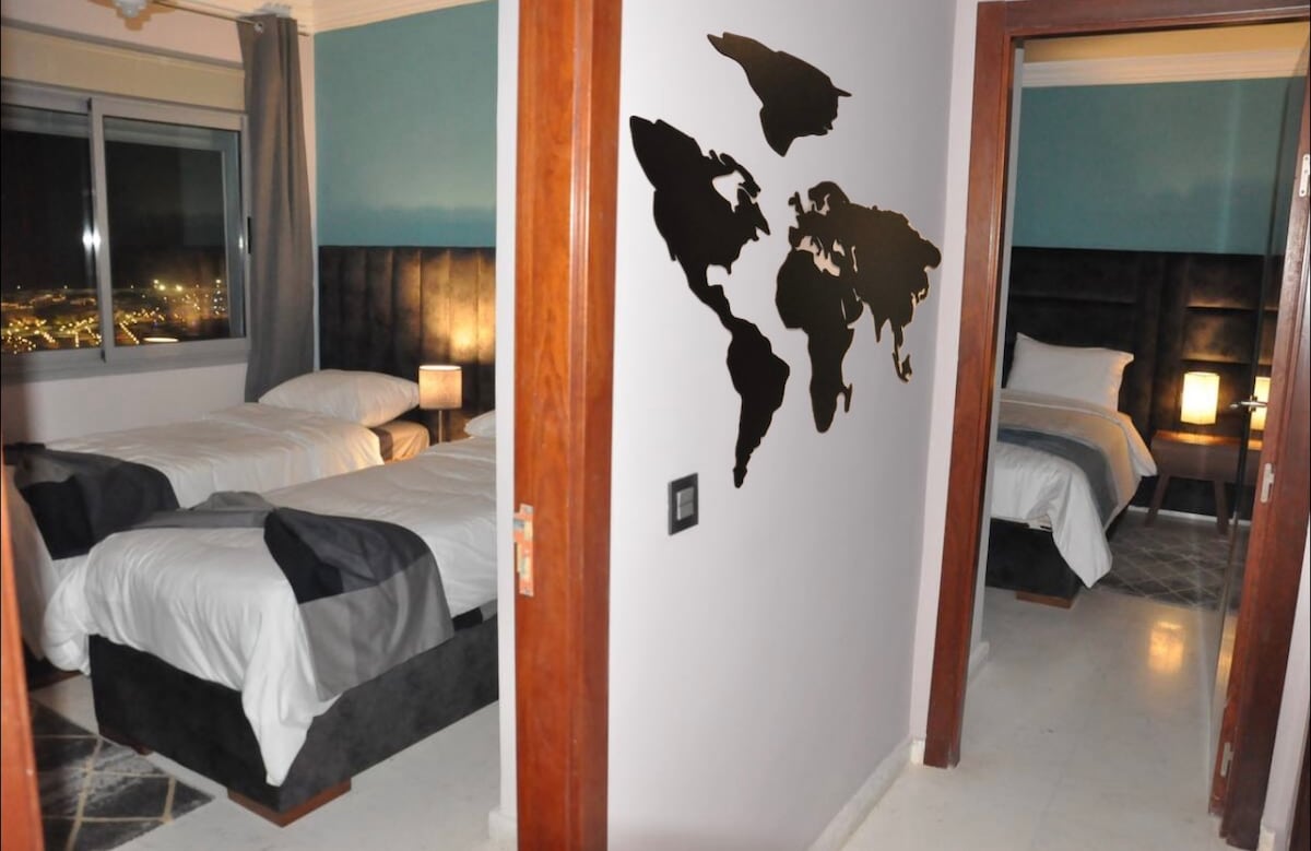 Probudite se uz zvuk talasa i zadivljujući pogled na Sredozemno more, zaliv Tanger, pa čak i Španiju. Ovaj 2BR stan uz more u popularnoj Malabali nudi panoramski pogled iz svake sobe, terase, direktan pristup plaži, kompletnu kuhinju, pametni TV, brzi Wi-Fi, klima-uređaj i ograđeni parking. Samo 5 minuta hoda do kafića, parka Villa Harris i hotela Mogador. 11 minuta do Grand Soko. ⚠️ Nalazi se na 2. spratu (60 koraka od garaže), nema lifta. Krevet 👶 za bebe i stolica za hranjenje dostupni su na zahtjev.