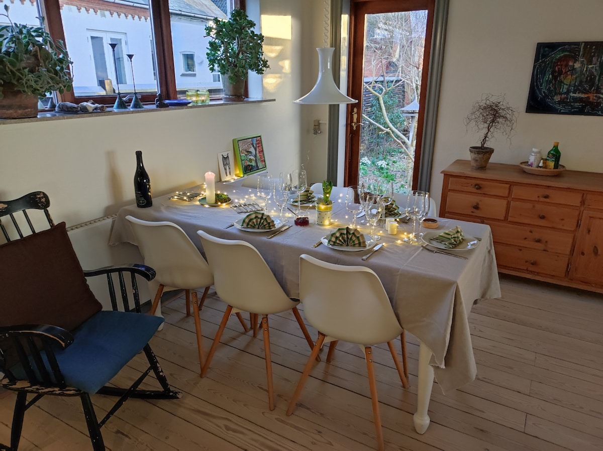 Udobna seoska kućica u istorijskom okruženju u ljupkom Južnom Finu. Ako vozite EV, možete da napunite automobil pored kuće. Lokacija je blizu mora i peščane plaže sa pogledom na šumu i polja koja pripadaju zaštićenoj vili Hagenskov. Savršeno mesto za istraživanje lokalne hrane i prirode Fina, Helnćsa, Faaborg-a i Asensa. Opustite se ispred kamina napolju uveče - i istražite prirodu na biciklima ili peške danju. Biće nam drago da vas vodimo.