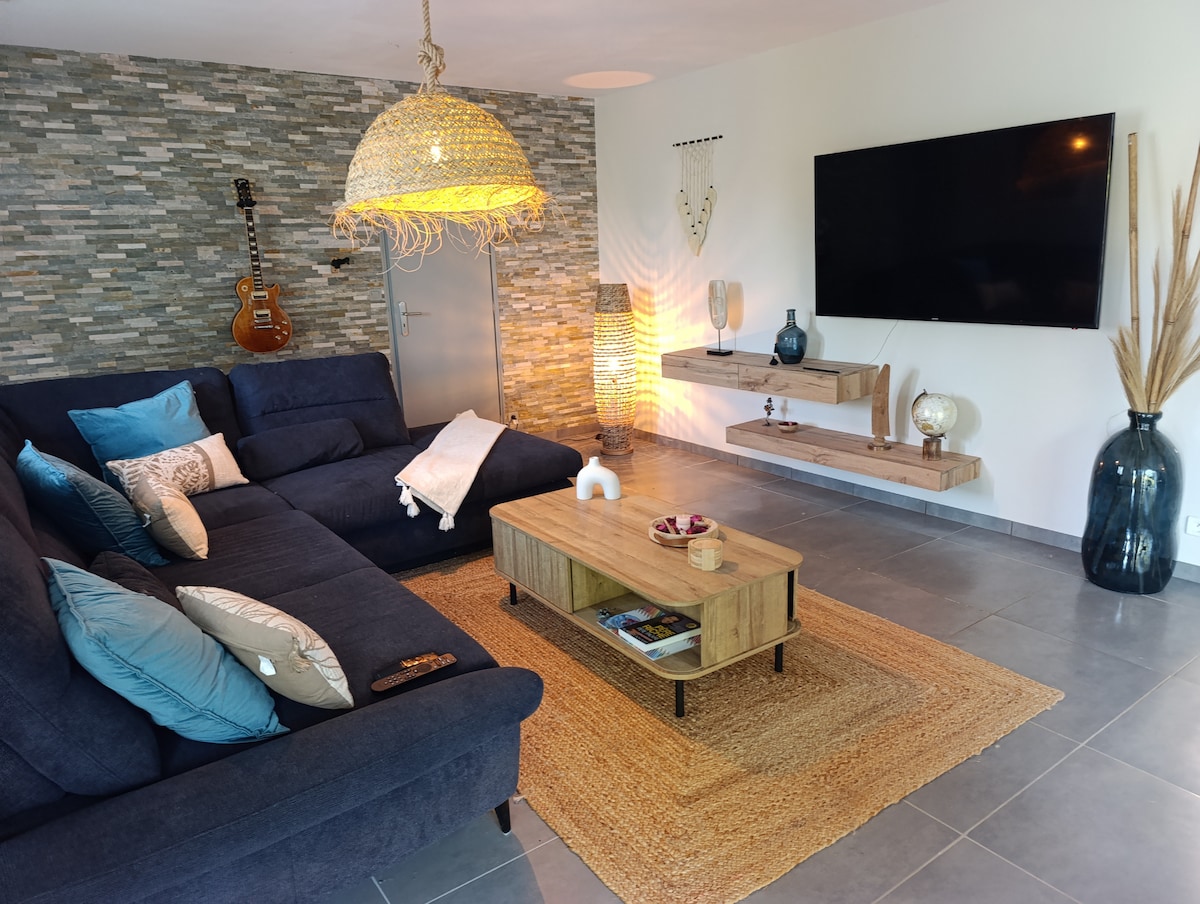 Šarmantna mala samostojeća kuća, uključujući 1 veliki dnevni boravak sa kaučem na razvlačenje, 1 potpuno opremljenu kuhinju sa barom, mašinom za sudove, zamrzivačem, mikrotalasnom rernom, 1 mezaninska spavaća soba otvorena za dnevni boravak sa 1 krevetom u 160, 1 tuš kabina sa tušem i WC-om. TV sa ravnim ekranom, DVD plejer, hi-fi sistem, društvene igre, knjige, CD, DVD, veš mašina. Wi-Fi šumovito zemljište. Mirno i bukolično okruženje... Predivna terasa sa roštiljem, baštenskim nameštajem. Krevet napravljen po dolasku.