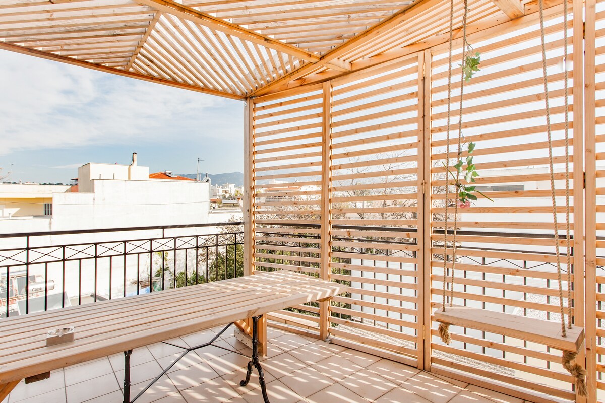 Udoban studio apartman na gornjem spratu od 30 kvadratnih metara s velikom privatnom terasom s pogledom na grad Atinu i brdo Likabet s jedinstvenim pogledom na Akropolj. Savršeno za vikend putovanje, istraživanje grada i rad na daljinu. - 15 minuta hoda do područja Kolonaki, modernog centra Atine sa mnoštvom kafića, restorana i barova. - 25 minuta hoda do trga Sintagma i istorijskog centra grada. - Mini pijaca udaljena 1 minut.