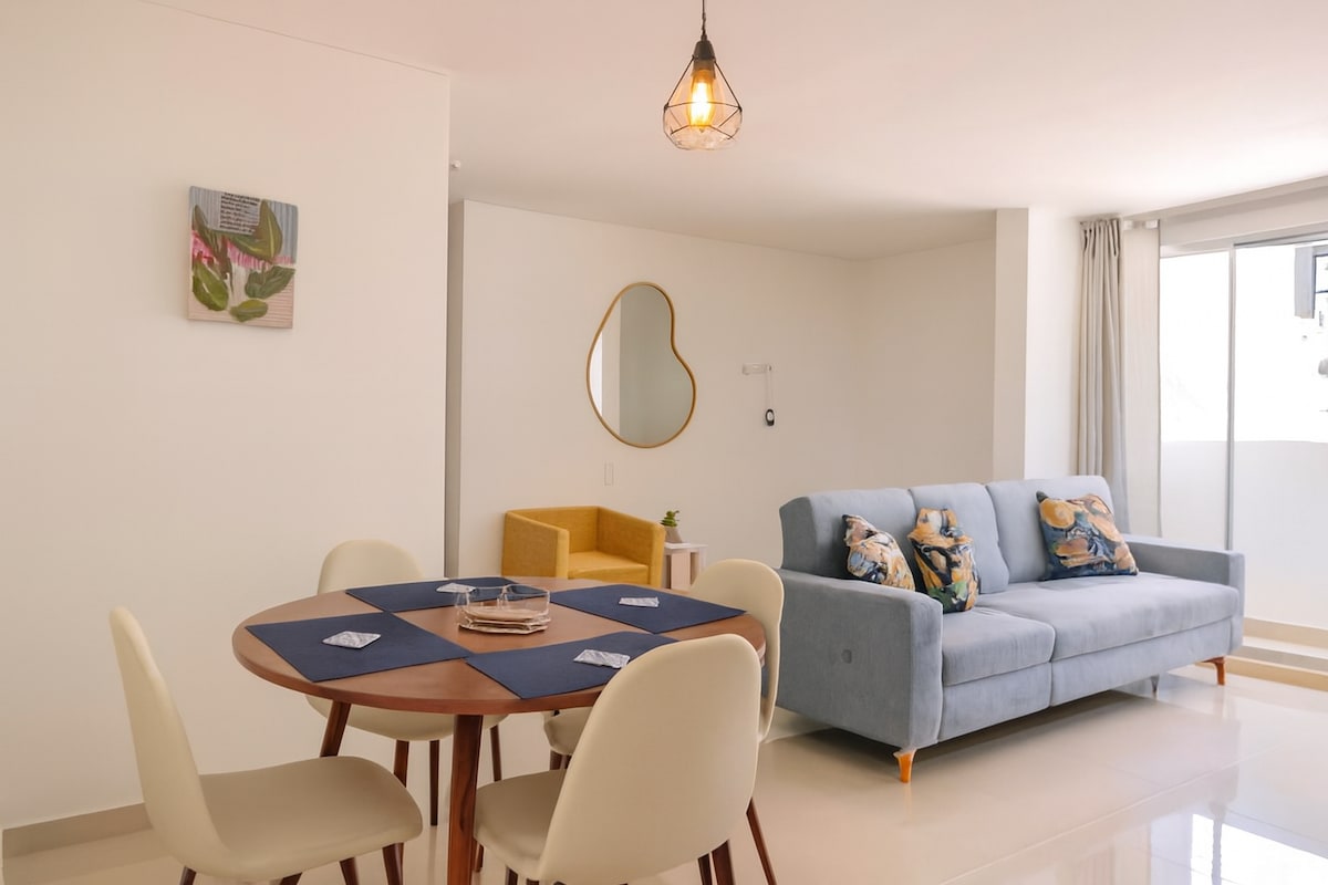 Udoban i prelep stan sa 2 spavaće sobe, svaka sa garderobom, privatnim kupatilom i AA. Glavna soba sa bračnim krevetom (još jedan bračni krevet ispod) i sporedna soba sa dva kreveta (još dva kreveta ispod). Potpuno opremljena kuhinja. Dnevni boravak i studio sa AA. Brzi Wi-Fi i kablovski signal 3 Smart TV. Zgrada sa bazenom i teretanom. Bezbjedno područje. Imajte na umu da morate da pošaljete dokumentaciju prije prijave (kolumbijski zakoni).