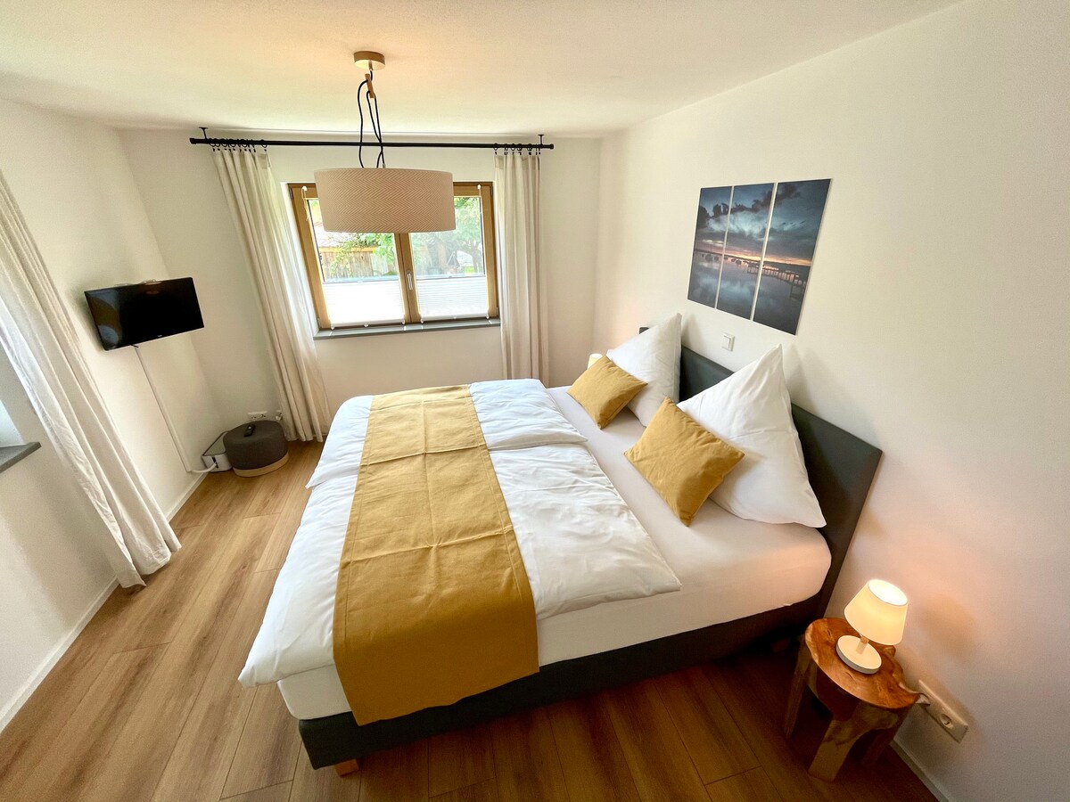 Dobro došli u ovaj elegantni, novouređeni stan u gradskim planinama na vratima Augsburga. Nudi vam sve što vam je potrebno za sjajan boravak: → udoban bračni krevet u spavaćoj sobi (širine 180 cm) → nije obavezno, pun i udoban bračni krevet u dnevnom boravku (širok 160 cm) → sopstveni lanai → Smart TV → Nespresso kafa → kompletno opremljena kuhinja → Stropni ventilatori → velika ugaona kada radni sto → podesiv po visini Povezanost → javnim prevozom do Augsburga