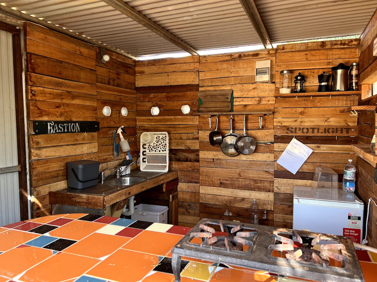 Naša kamp-prikolica iz 1959. godine dugačka je samo 3,6 m (12 ft) i najbolja je za par ili dva prijatelja. U krajnjem slučaju, dvoje djece može da spava u bračnom krevetu (širine 125–149 cm); pogledajte fotografije i opis u nastavku. Probudite se uz zvukove Lirebirda, uživajte u privatnoj šetnji našim prašumskim jarugama i prošetajte baštom, jednim od najboljih privatnih vrtova u Dandenongsu. Nudimo boravak od najmanje jednog noćenja za kratak odmor, a možete i da ostanete duže i uživate u miru, da sjedite pored vatre – napravljene od bureta za pivo – i pečete marshmallow kolačiće.